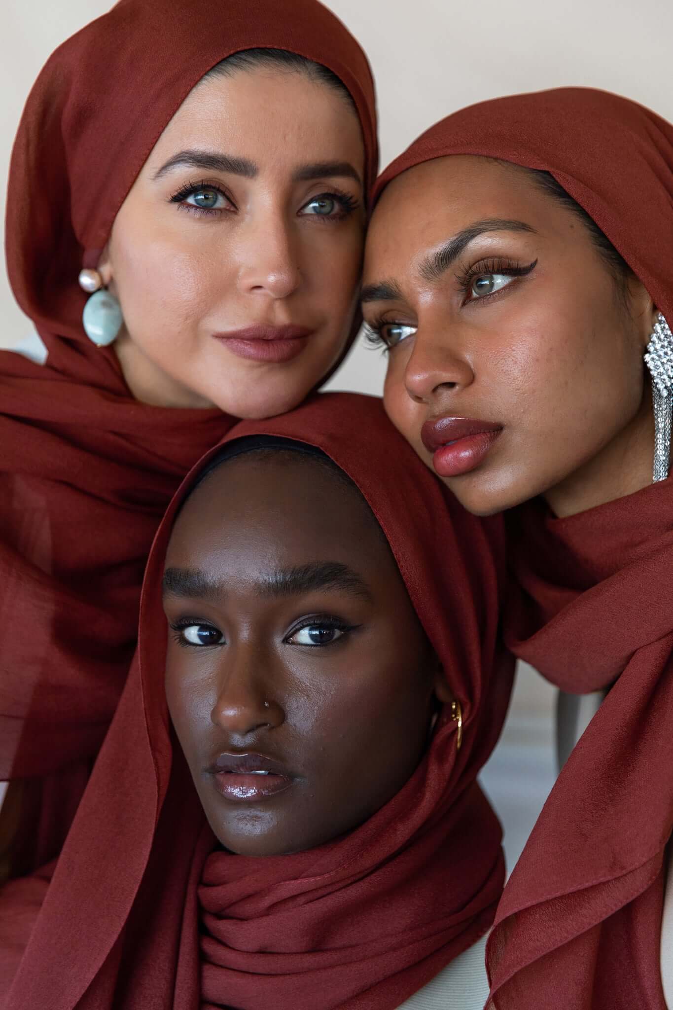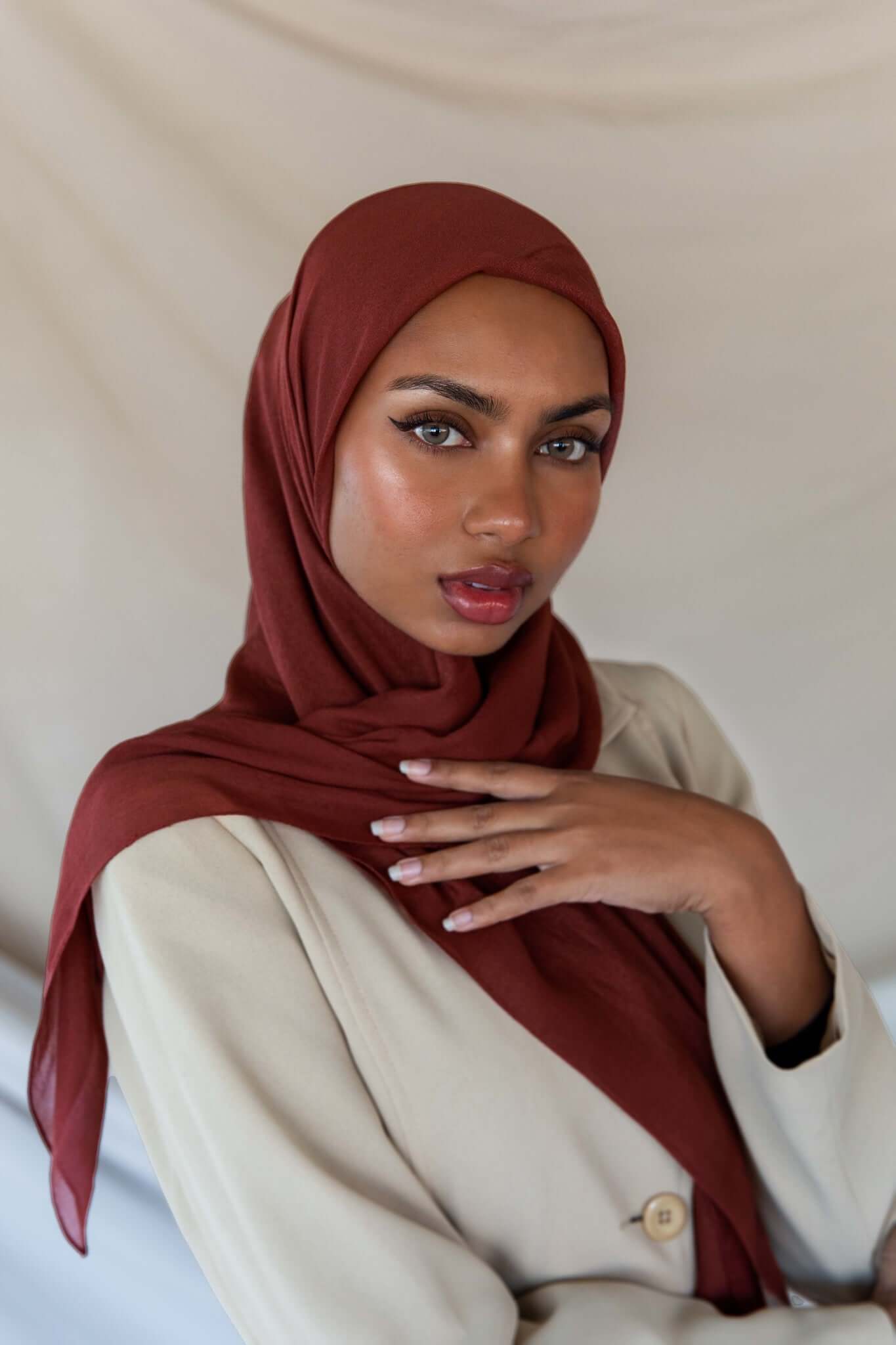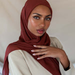 Your new forever favorite hijab is here in a warm henna color. Luxurious natural silk fibers add a touch of sheen to this breathable chiffon silk scarf that stays put. This silk chiffon hijab combines elegance with practicality.
