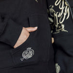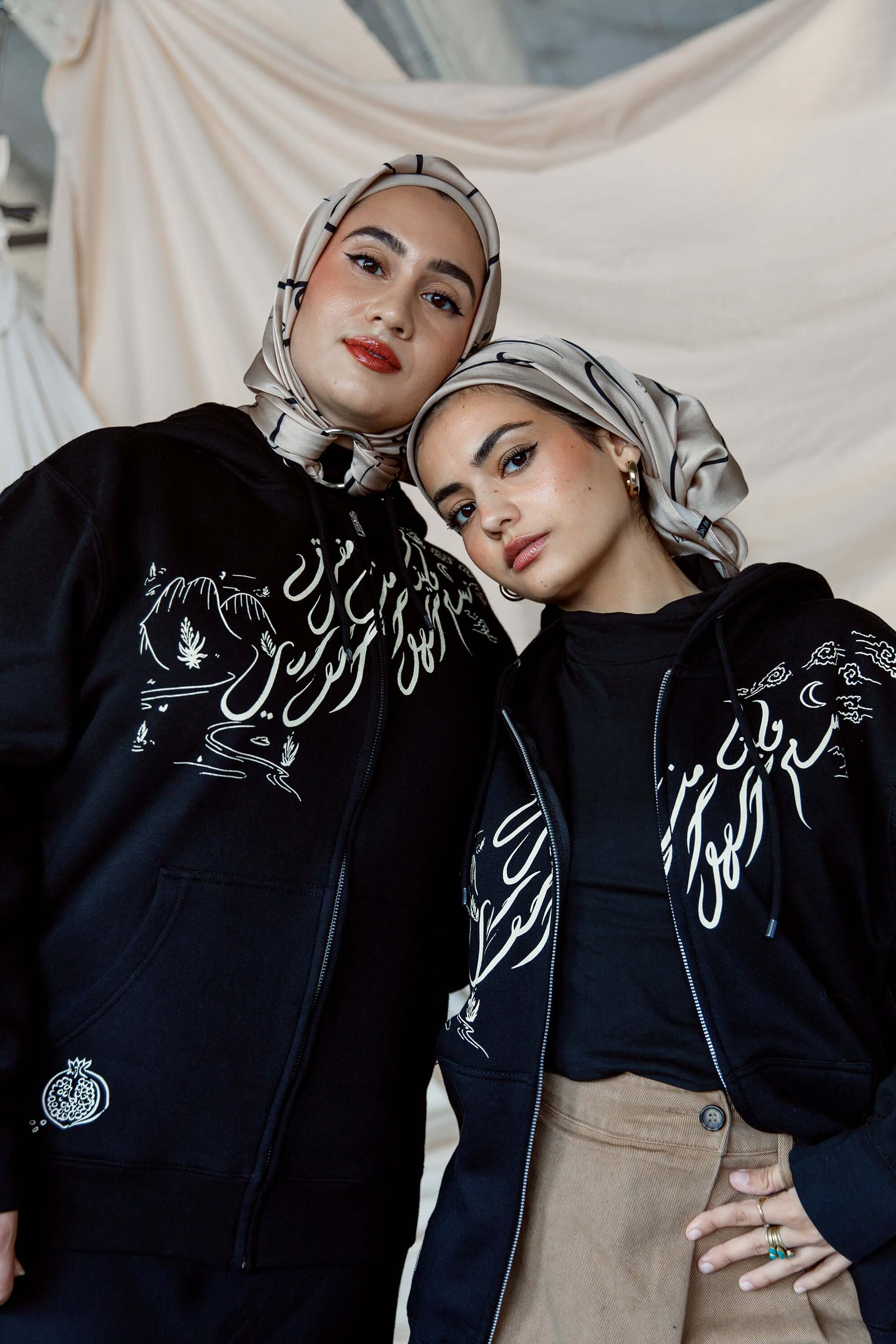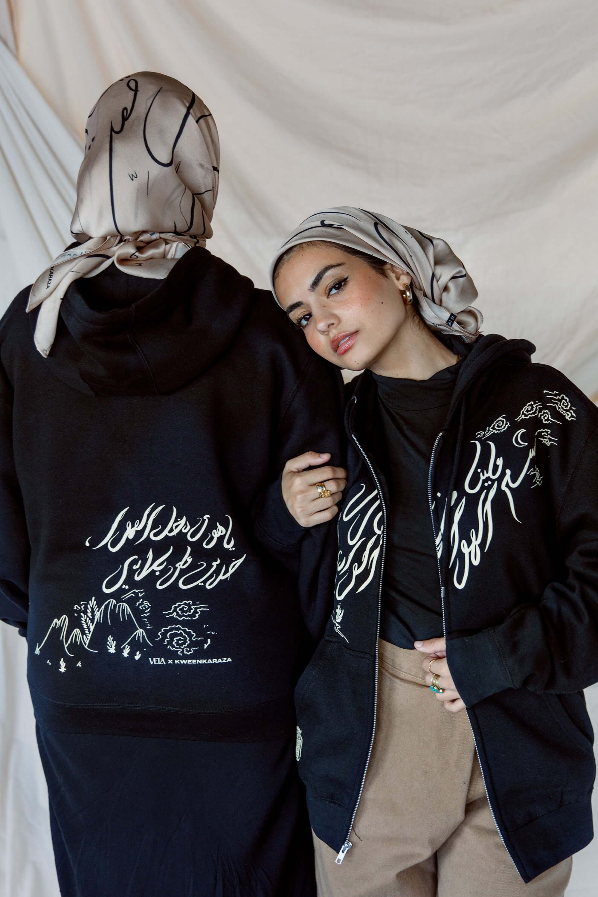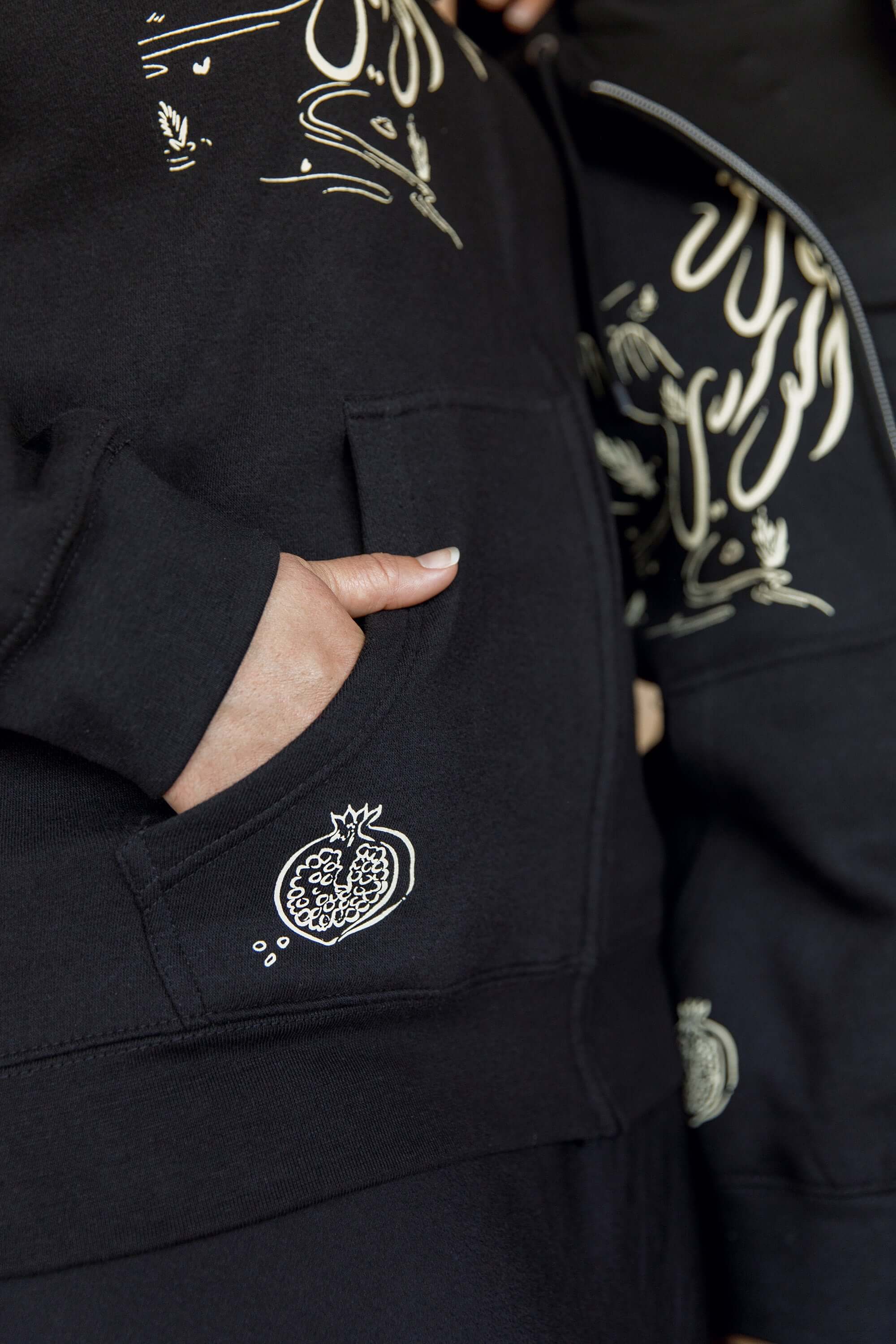A timeless zip-up to help you stay cozy in the winter breeze. With swirling clouds and lyrics of Fairuz & Umm Kulthum artfully drawn by KweenKaraza in white against soft cotton fabric, the pomegranate motif on the pocket adds the perfect touch. Hoodies are a relaxed fit and oversized.