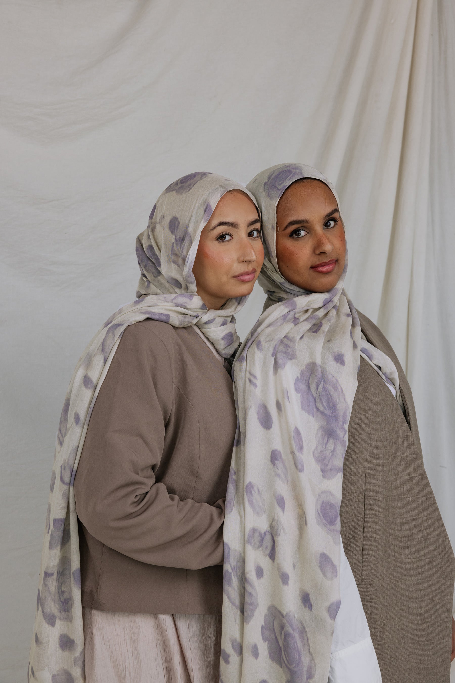 Capture the essence of early morning light with Morning Blossom, a soft cream and blue that evokes the delicate beauty of flowers opening in the first rays of sunshine. This serene shade is perfect for creating a calming, refined look that complements any season, offering a natural radiance to your ensemble. Designed from our signature lightweight modal fabric, this hijab captures the perfect blend of romance and comfort. A truly ethically made hijab, Morning Blossom is a soft blue headscarf and floral print scarf that embodies both beauty and intention.