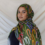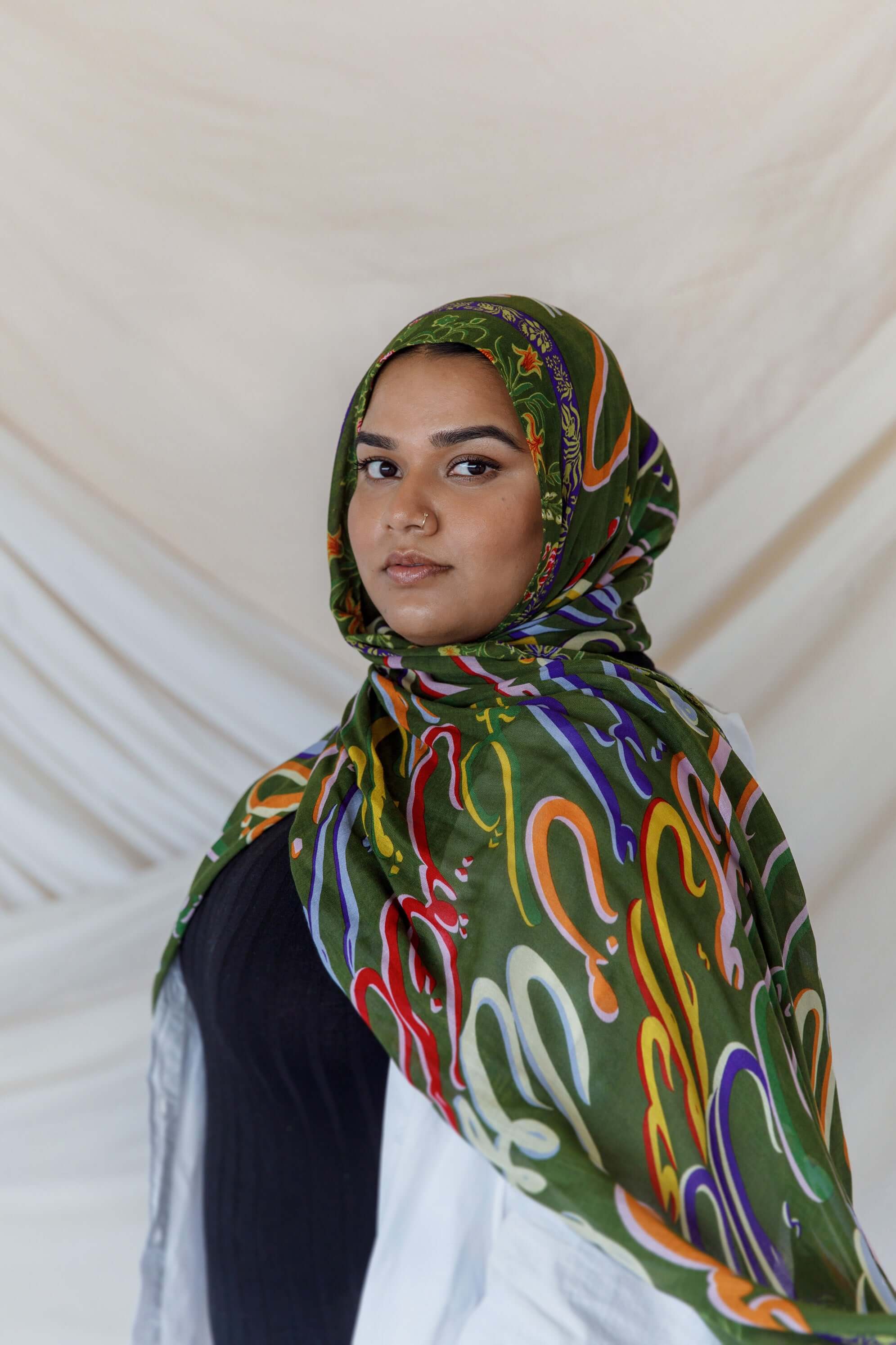Floral cultural elements and swooping calligraphy make this gorgeous hijab a stunner. Hand-drawn poetry by KweenKaraza captures the heartfelt words of Sufi mystic Rabia Al Basri as she speaks of her love for Allah (swt): ‘I came to know love the moment I found Your love.’ Woven in cozy modal against a dark mint background with a flattering combination of blues and pinks, you’ll be amazed at how many fits this hijab will elevate. Discover the Remembrance Green hijab online today, check out the Remembrance Green hijab price, and experience its captivating beauty firsthand.