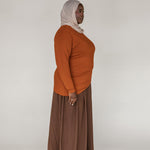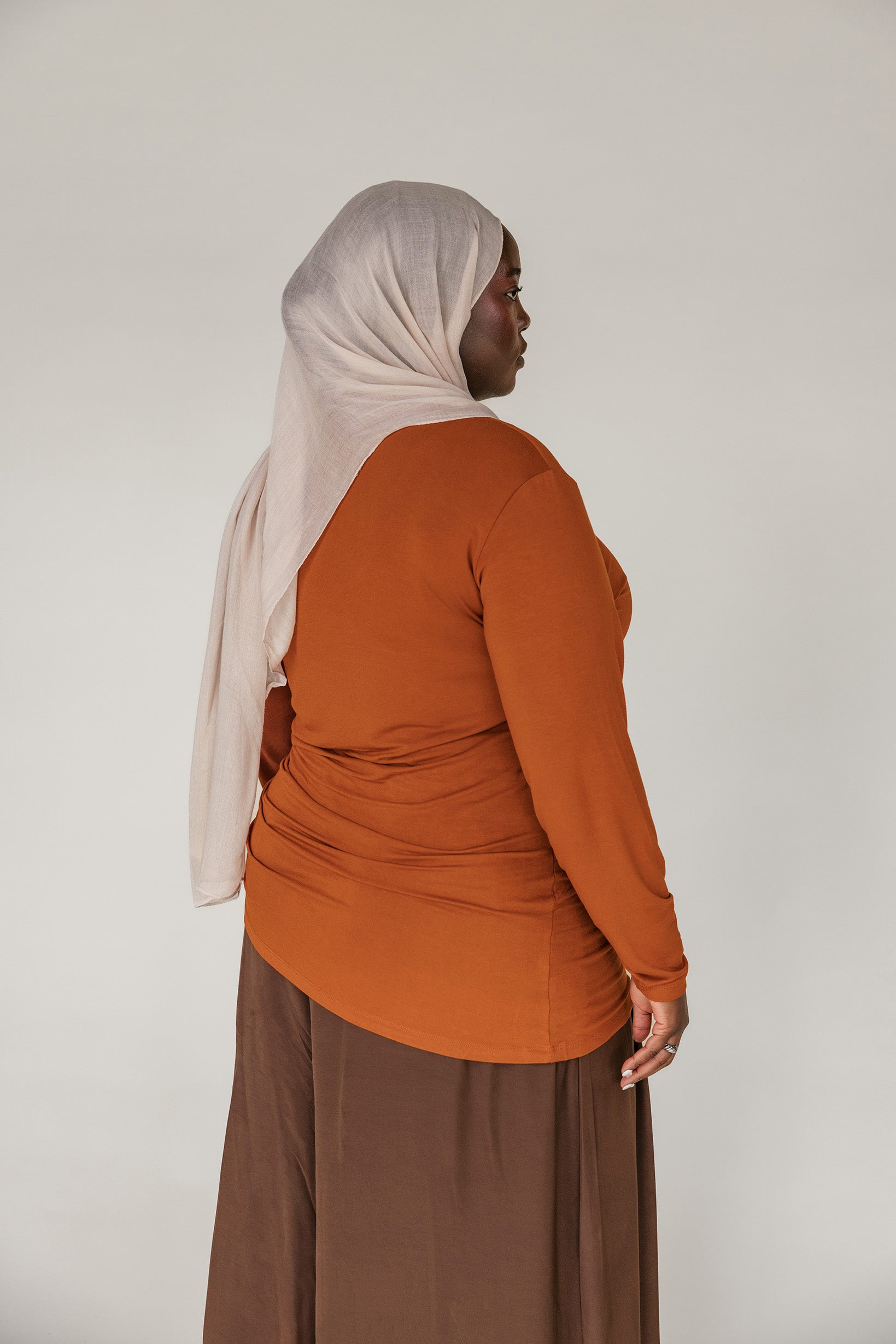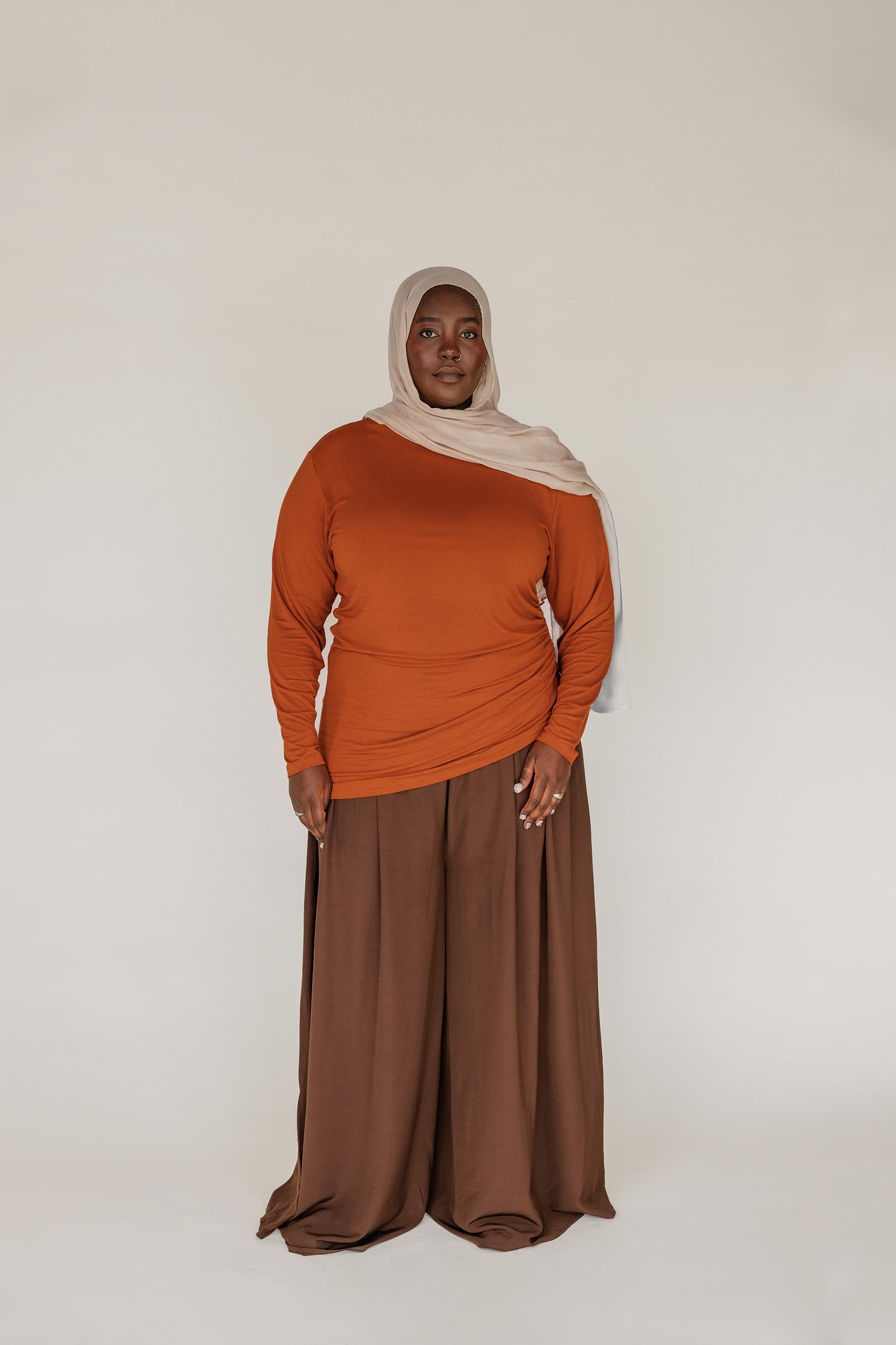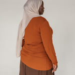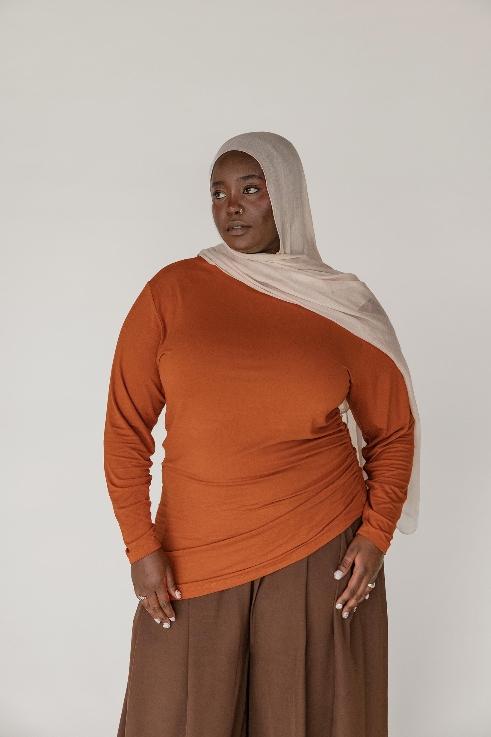 Khasnaa is a US 12 and wears a size 2XL in our Asymmetrical Long Sleeve Top in Rust.