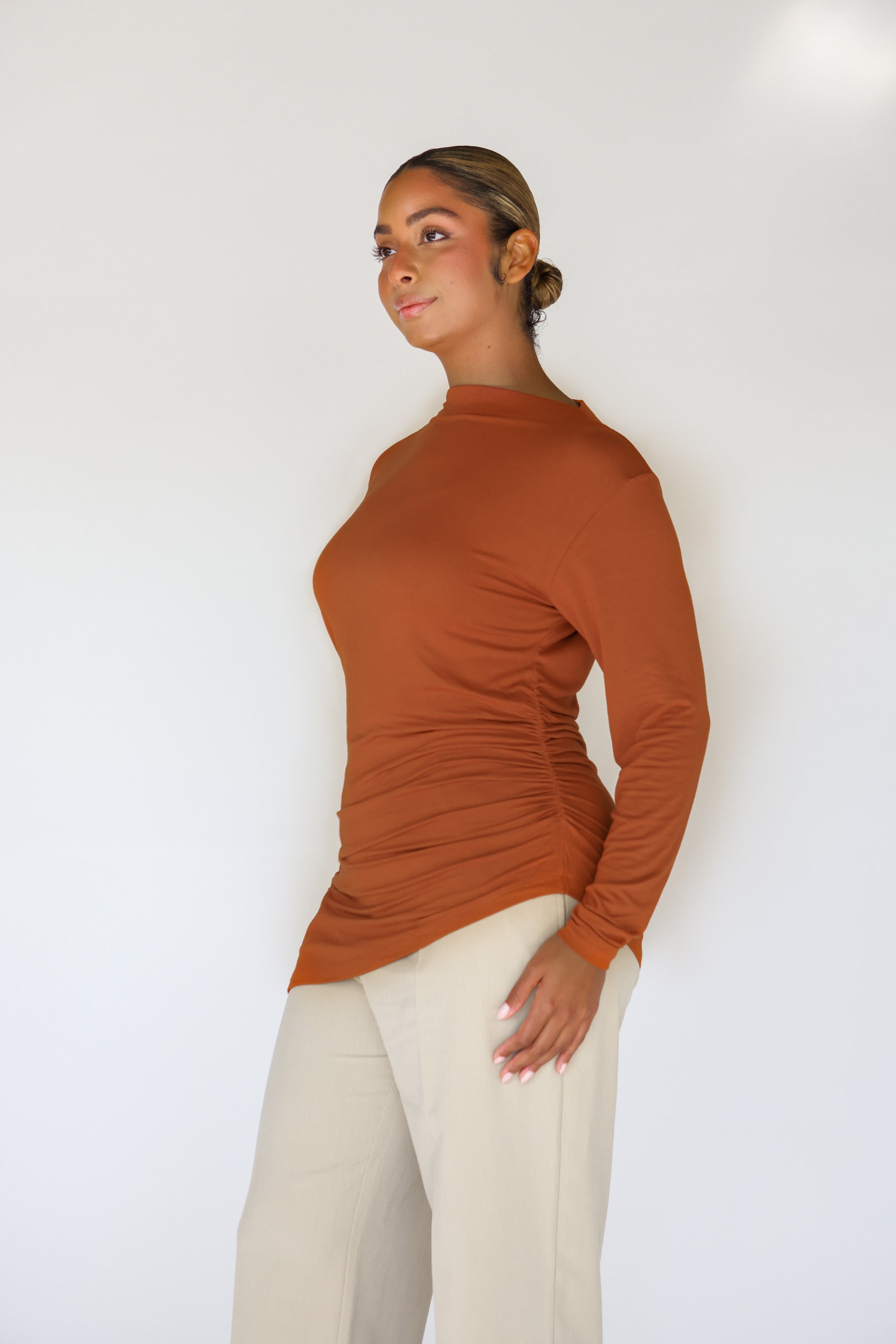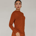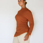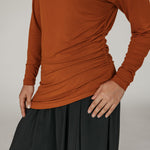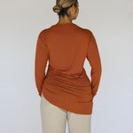 Ayanna is a US 8 and wears a size M in our Asymmetrical Long Sleeve Top in Rust.