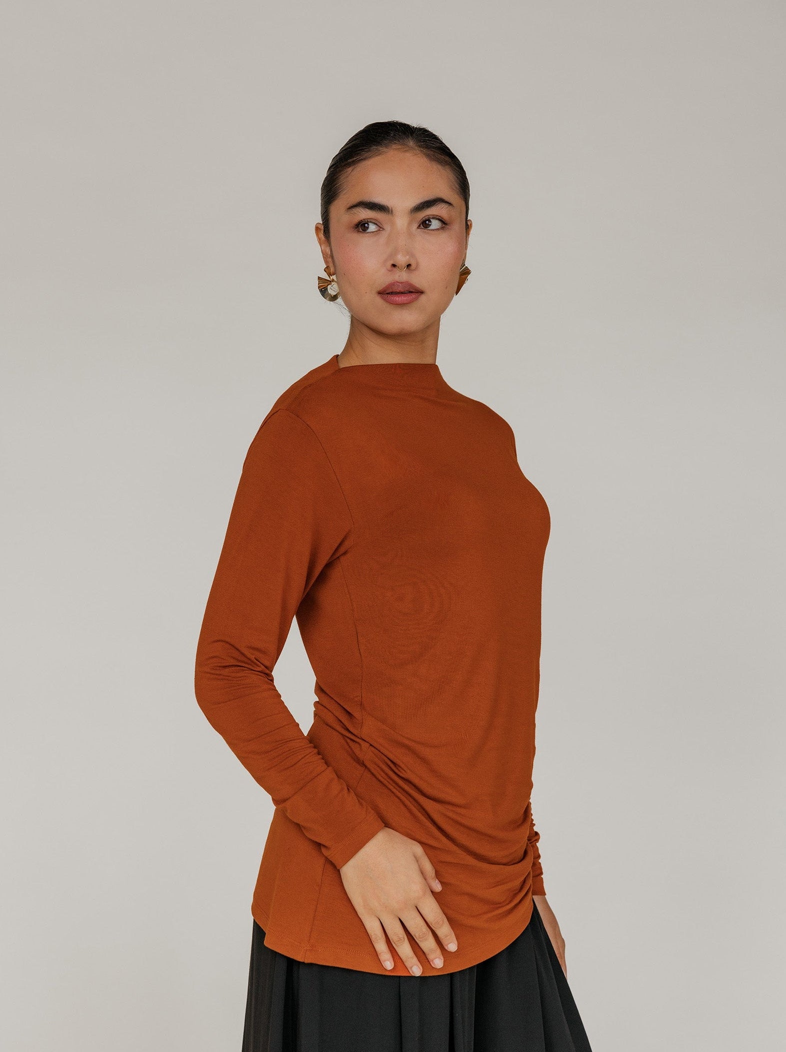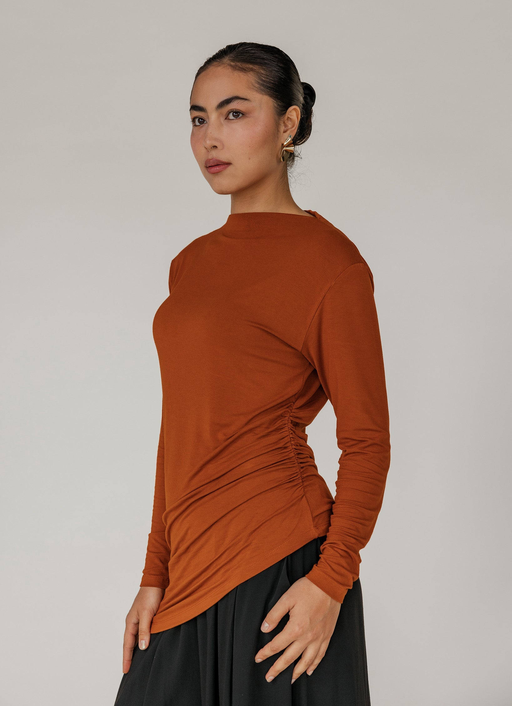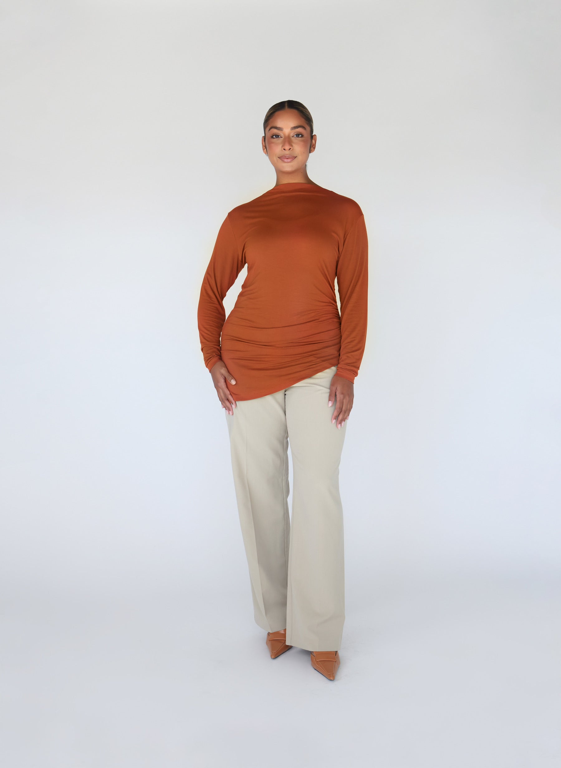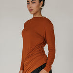 Assiya is a US 4 and wears a size S in our Asymmetrical Long Sleeve Top in Rust.