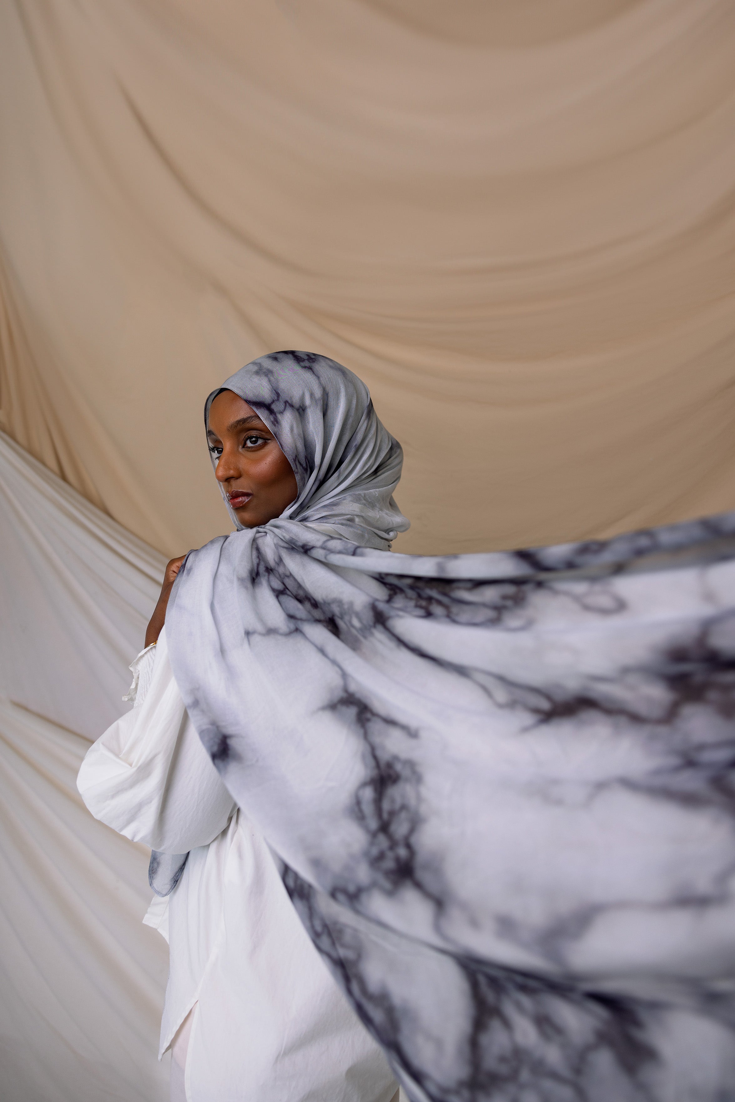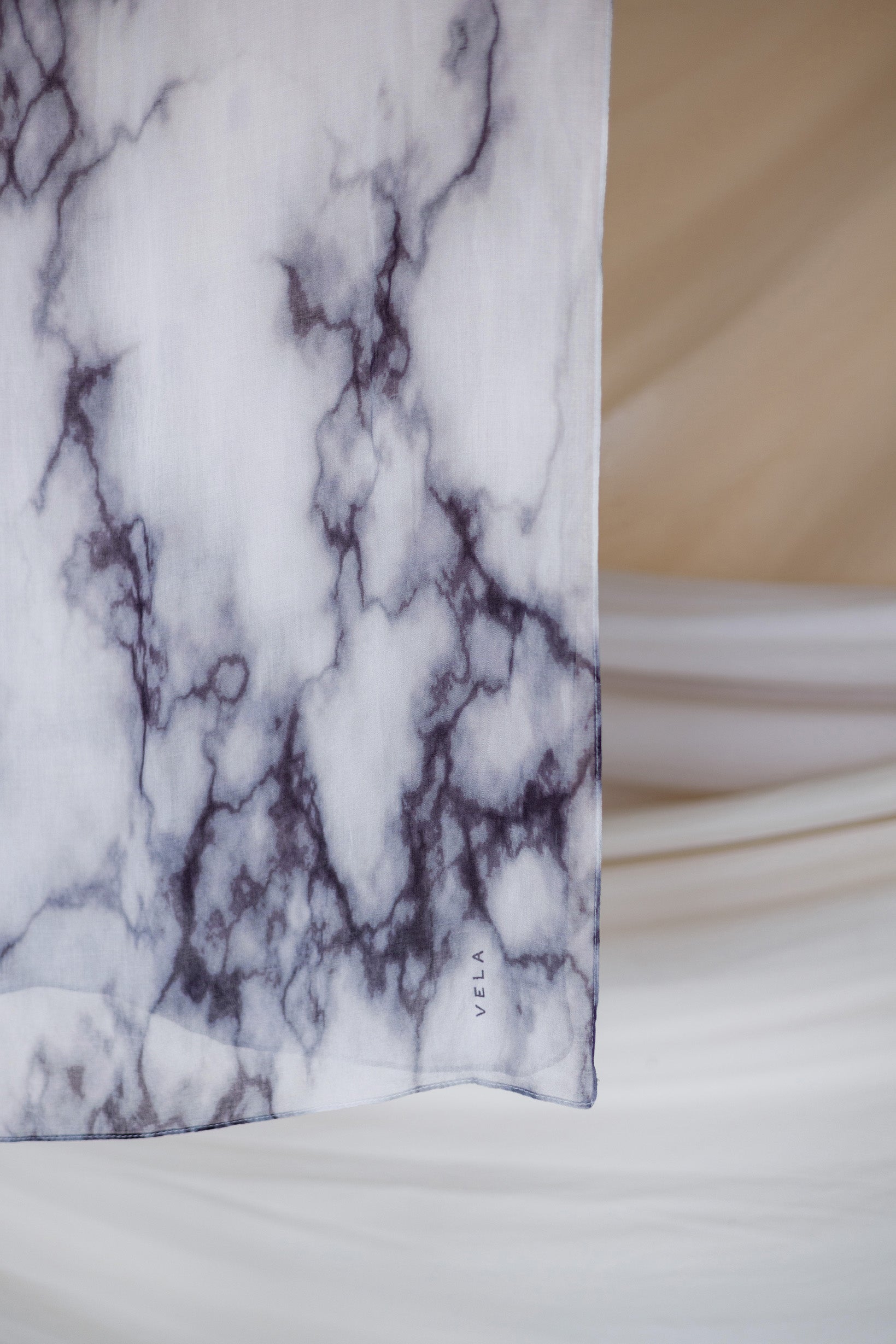 We brought back this OG Vela scarf because it was just too good not to. A supple white threaded with jet black, this airy scarf looks like smoky liquid and it’ll disappear real quick. Explore the unbeatable price for our Classic Marble hijab, available online. It’s one of the best Marble modal hijabs you'll find. Discover more stylish options with Vela scarves, including our exquisite Marble Chiffon hijab, for an elegant touch to your wardrobe. VELAs are uniquely crafted in batches, variations are expected.