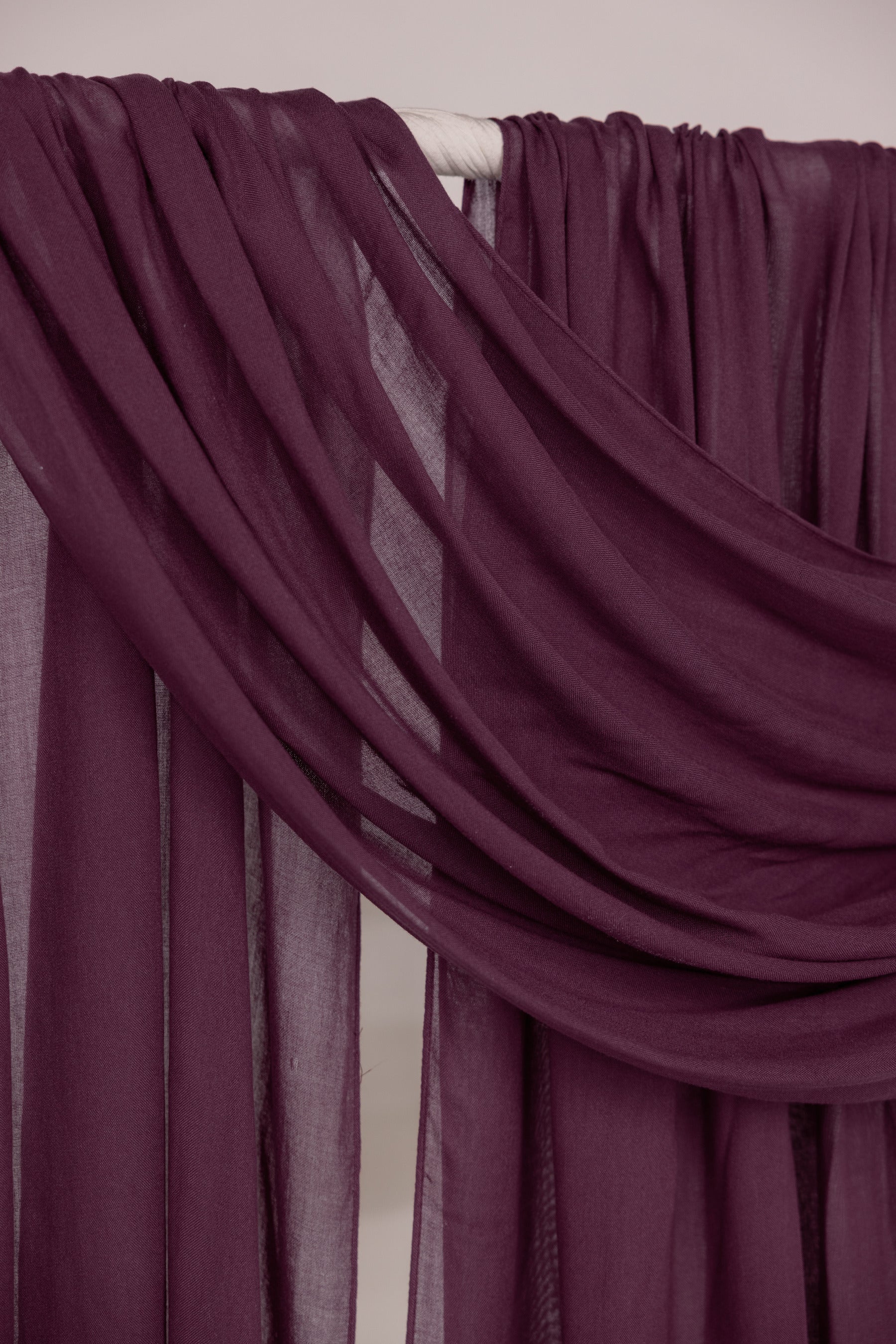 Woman wearing a purple red undertoned Fig Latte headscarf and gray outfit against a beige background