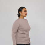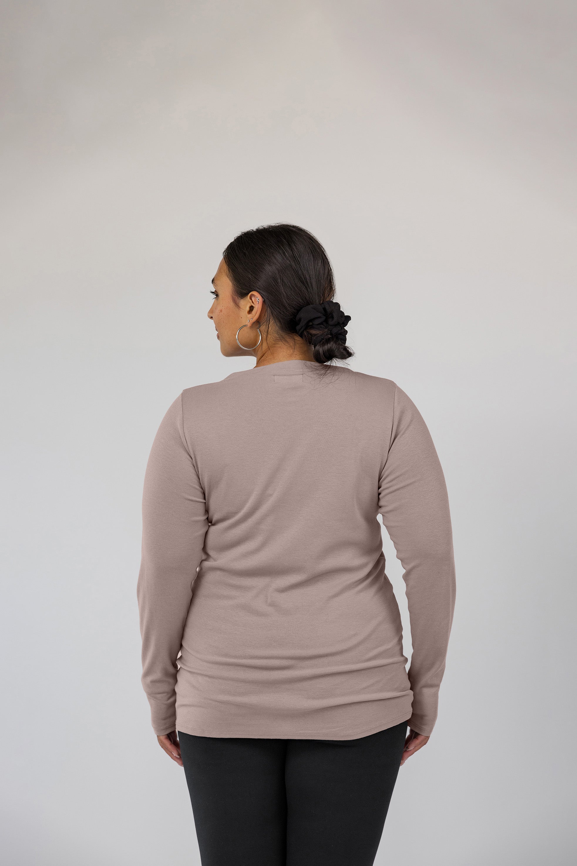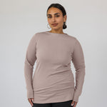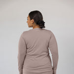 Sharon is a US size 12 and wears our Mock Neck Top in Taupe in a size XL.