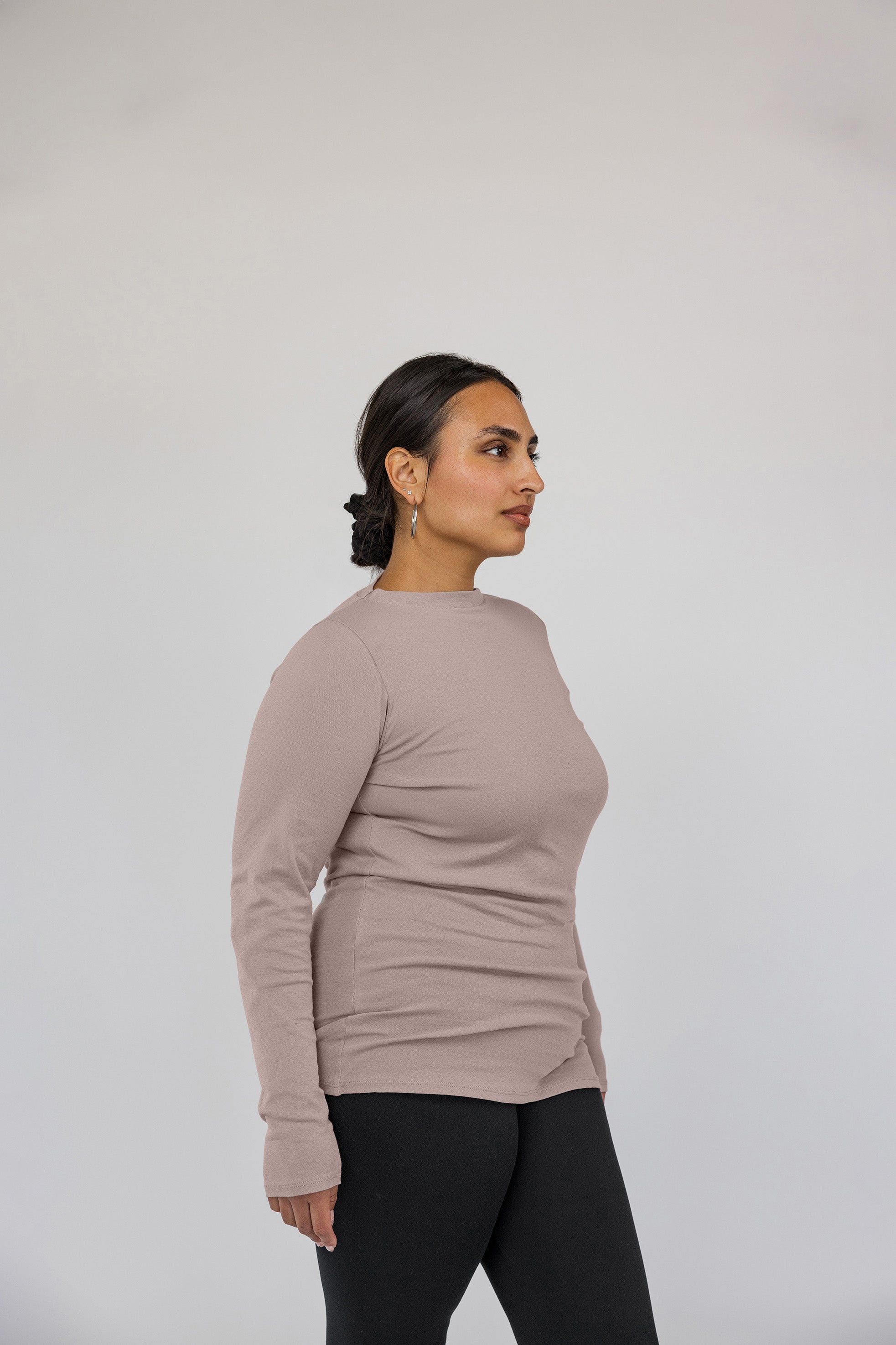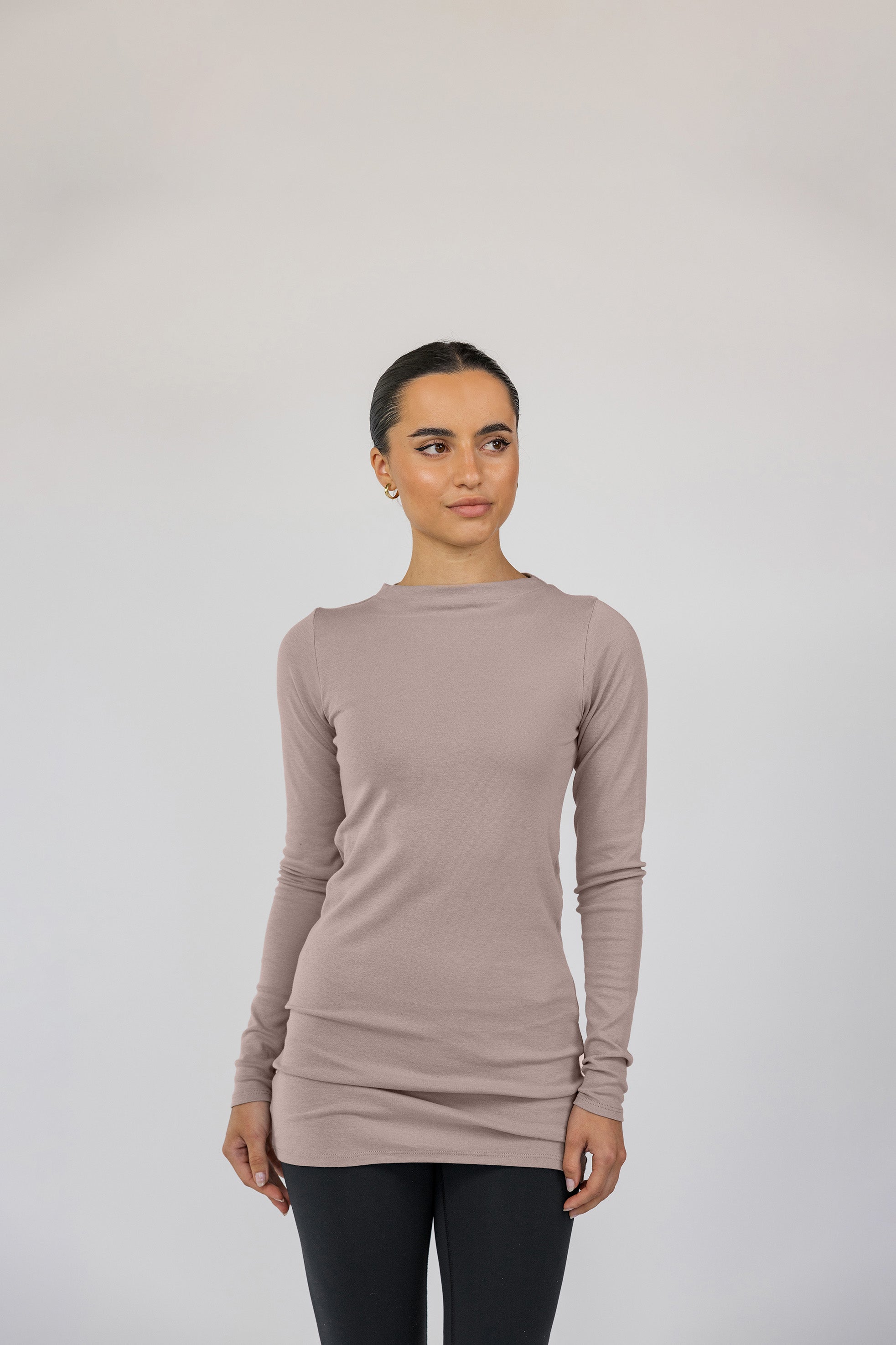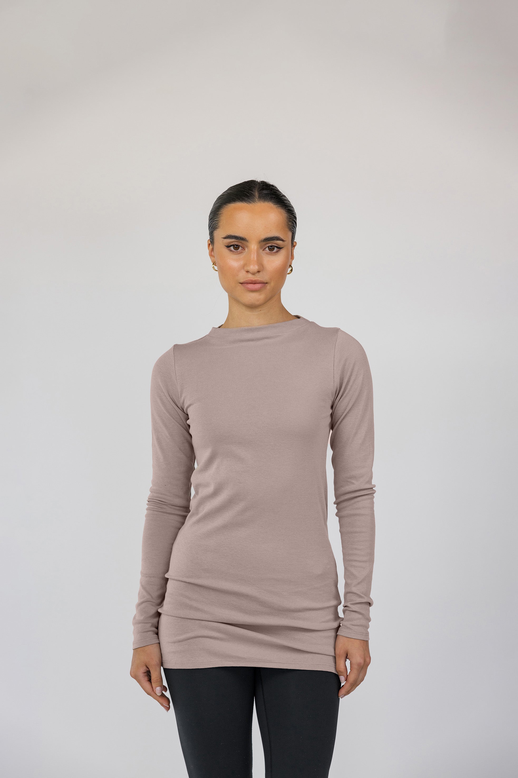Anna is a US size 2 and wears our Mock Neck Top in Taupe in a size XS.