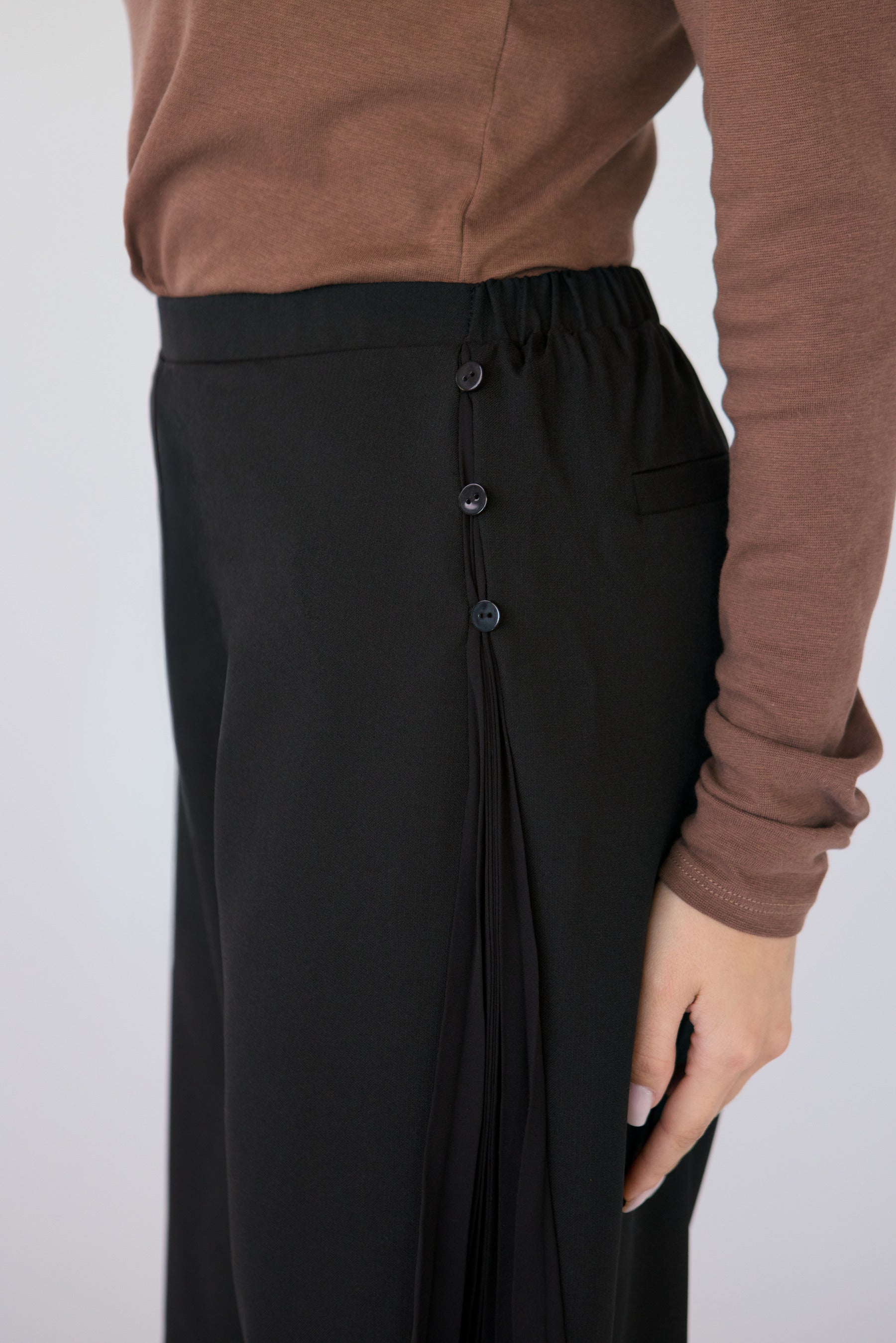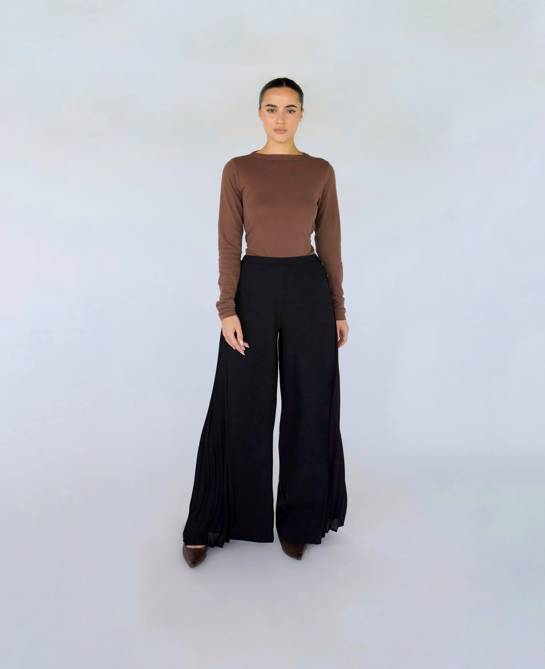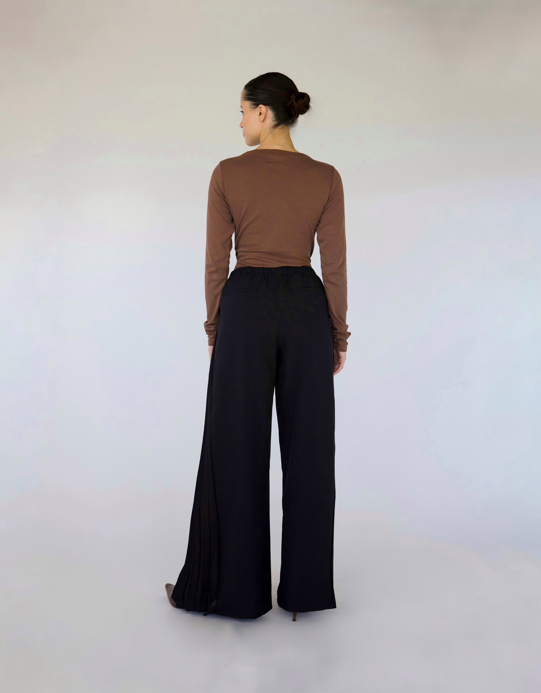 Tailored pleats meet soft chiffon detailing for a polished yet relaxed look. These contrast chiffon pants move with you while maintaining form. Available in Black in sizes XS–3XL.