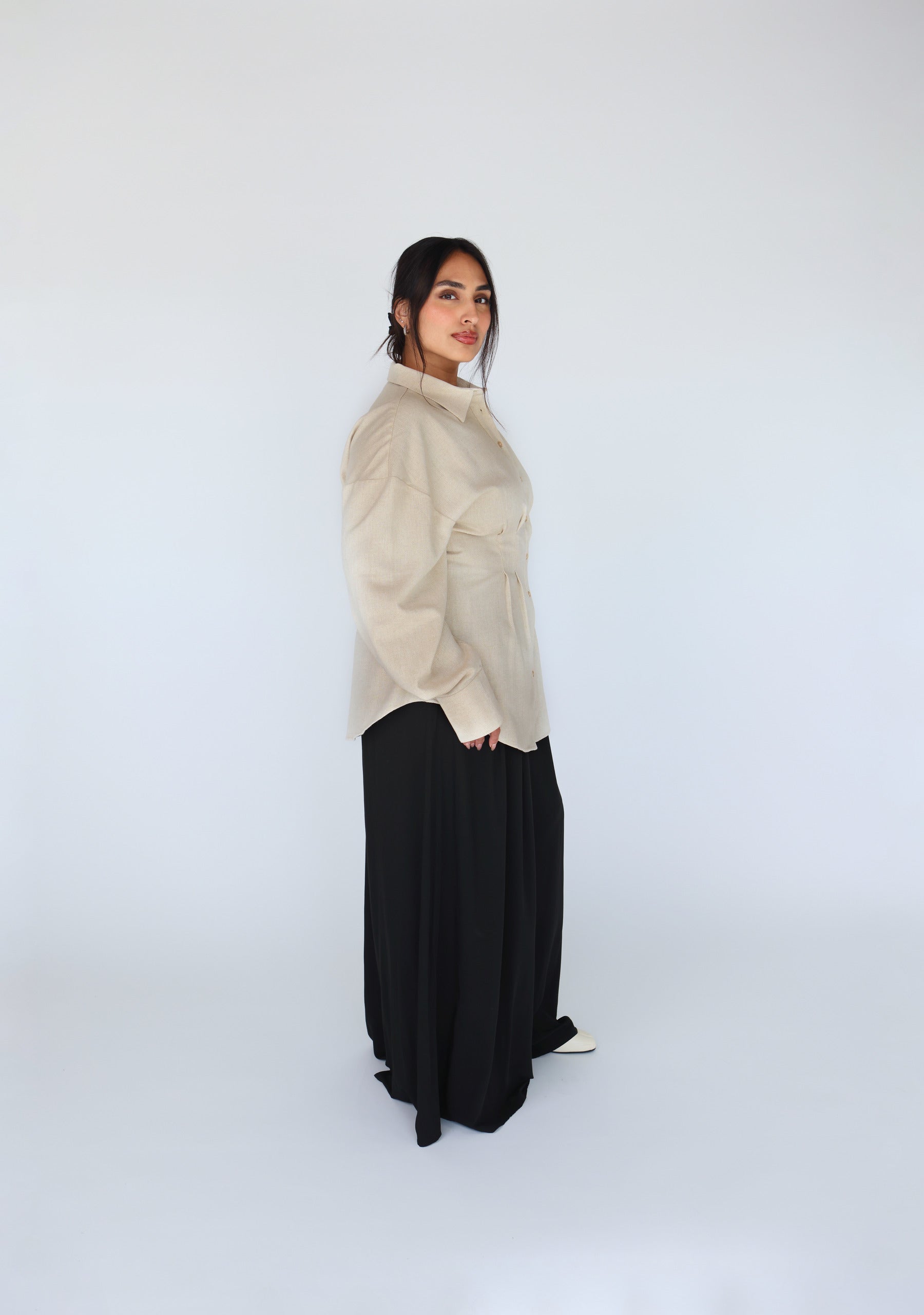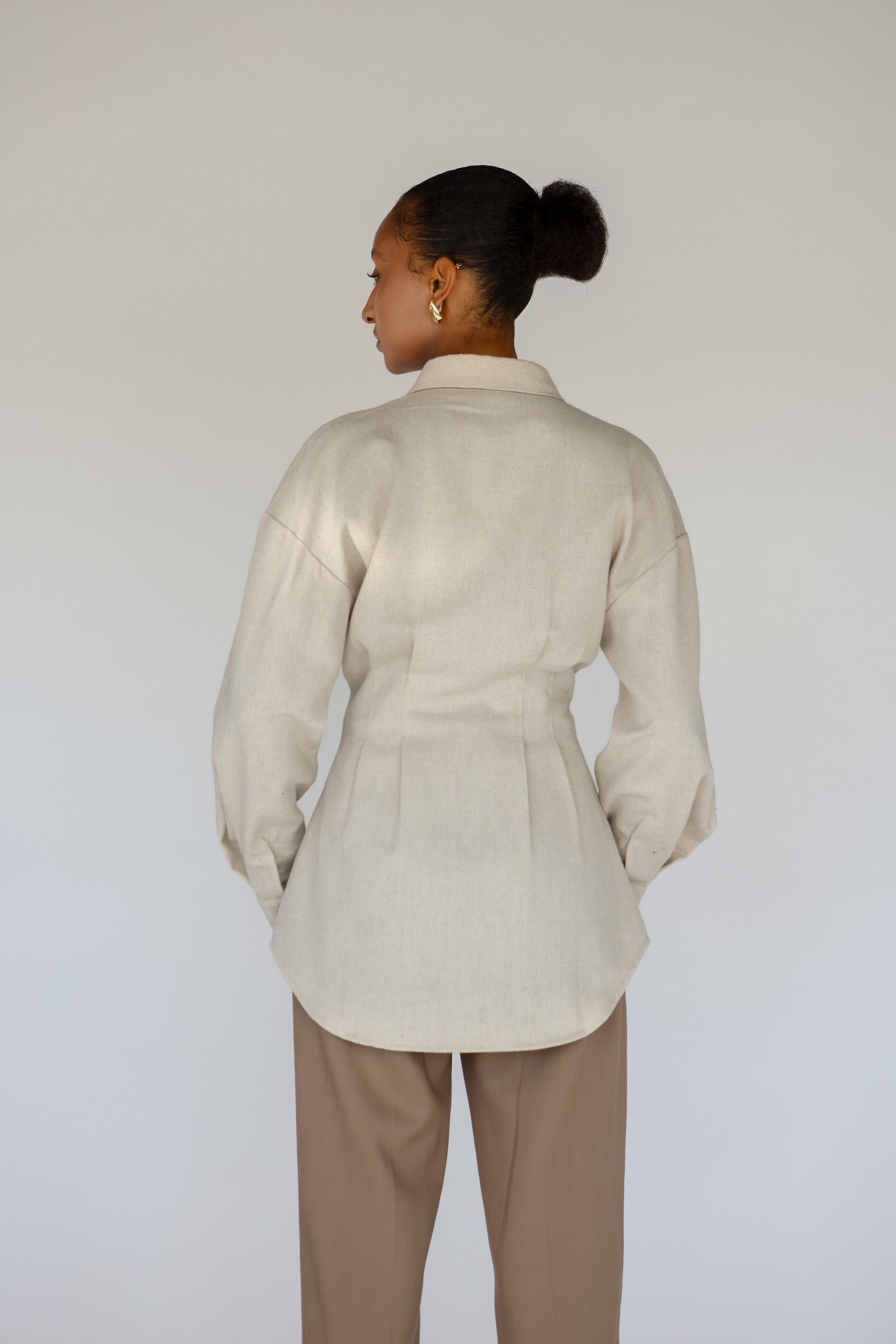 Marietou is a US 0 and wears a size XS in our Sculpted Button Up in Beige.