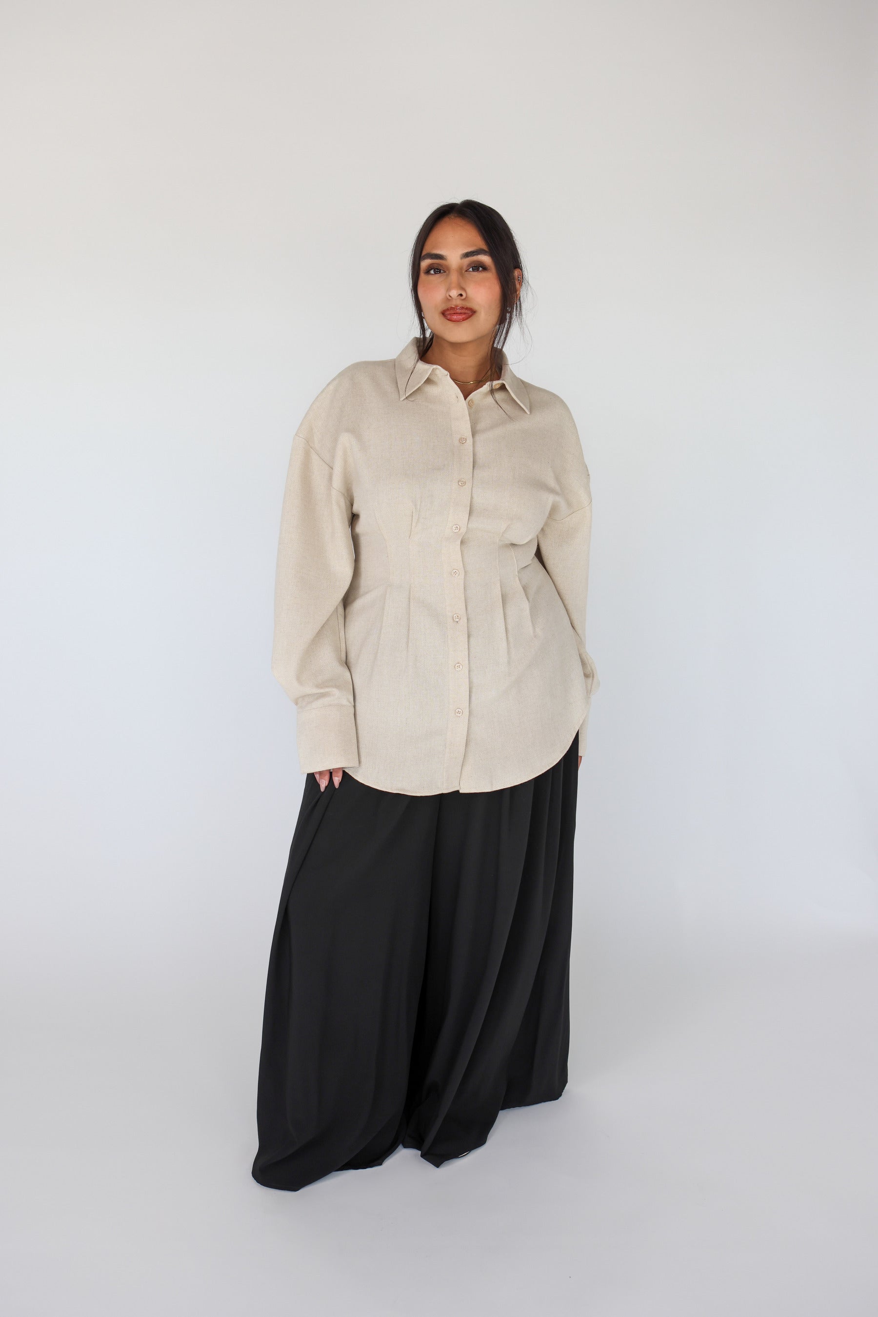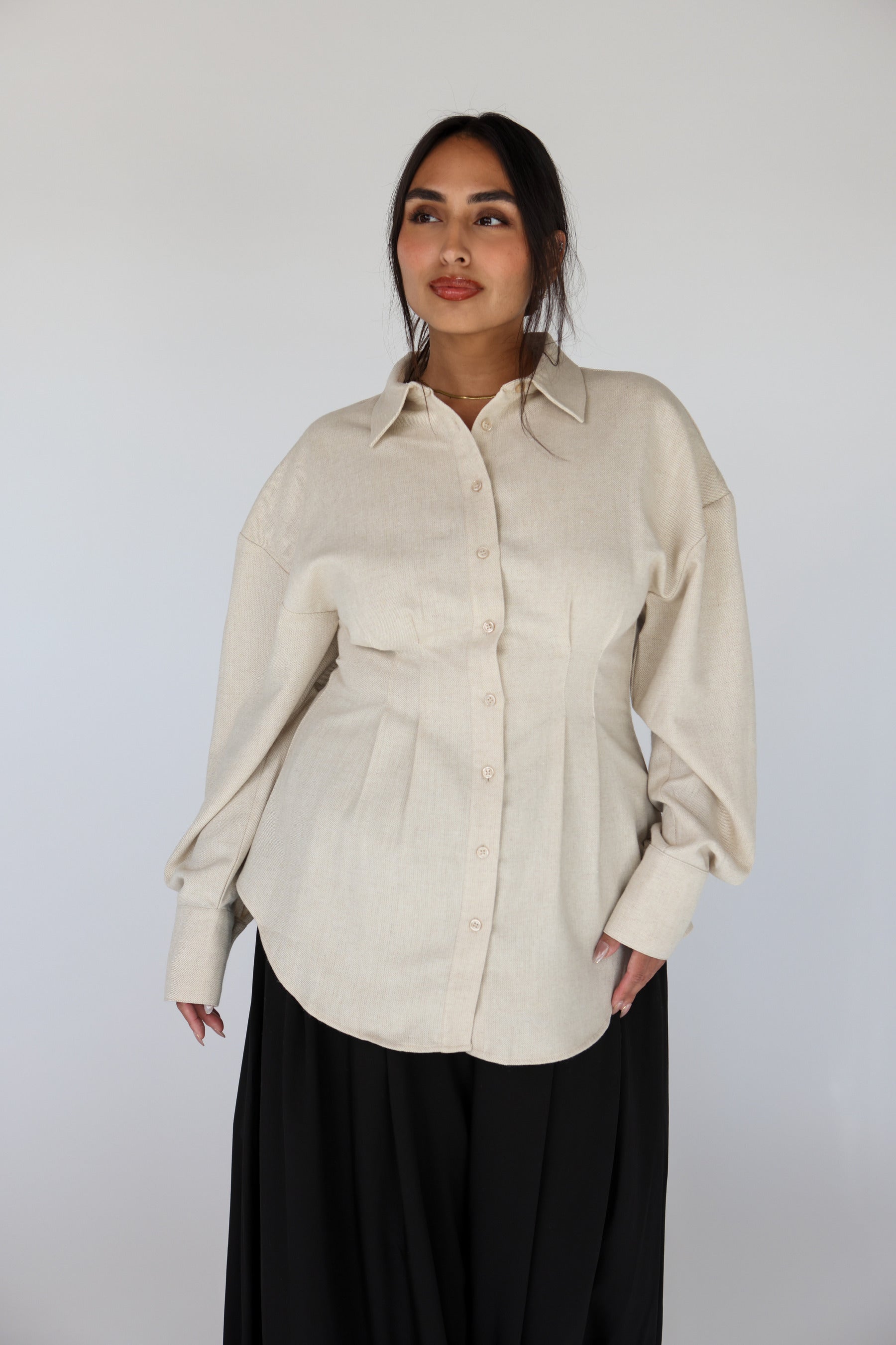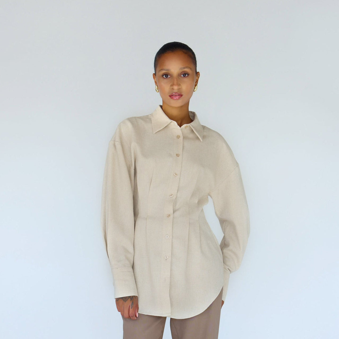 Sharon is a US10 and wears a size L in our Sculpted Button Up in Beige.