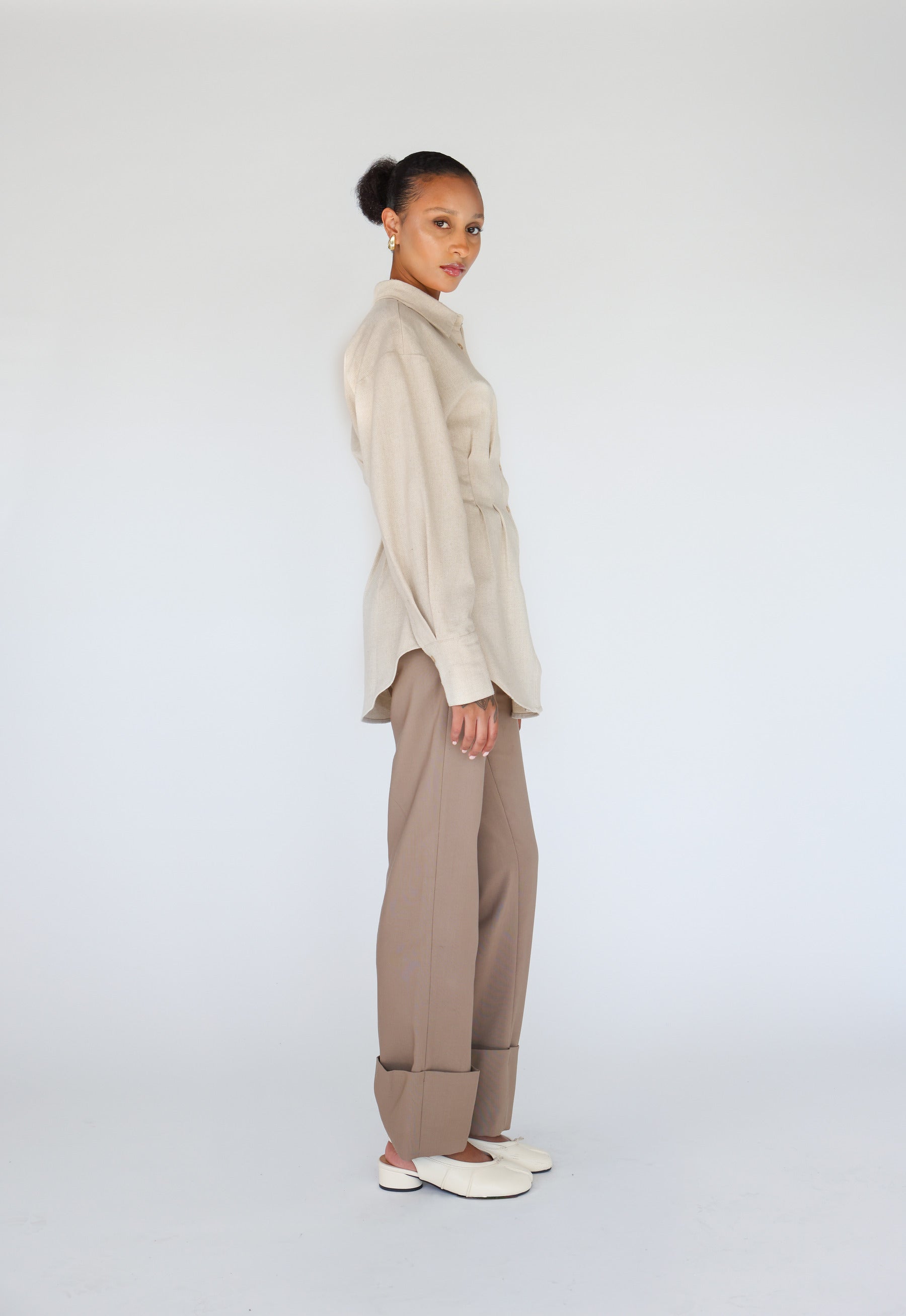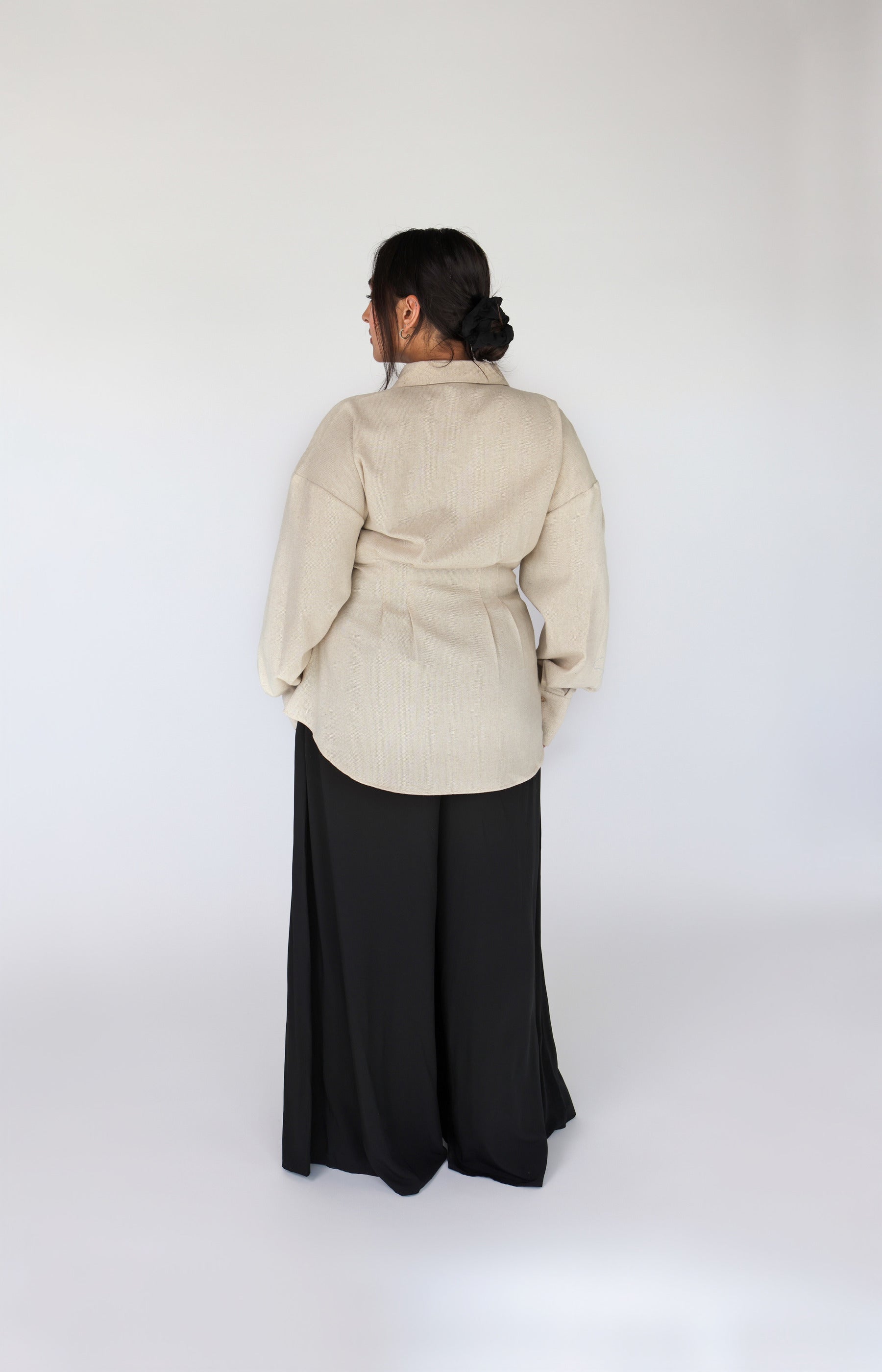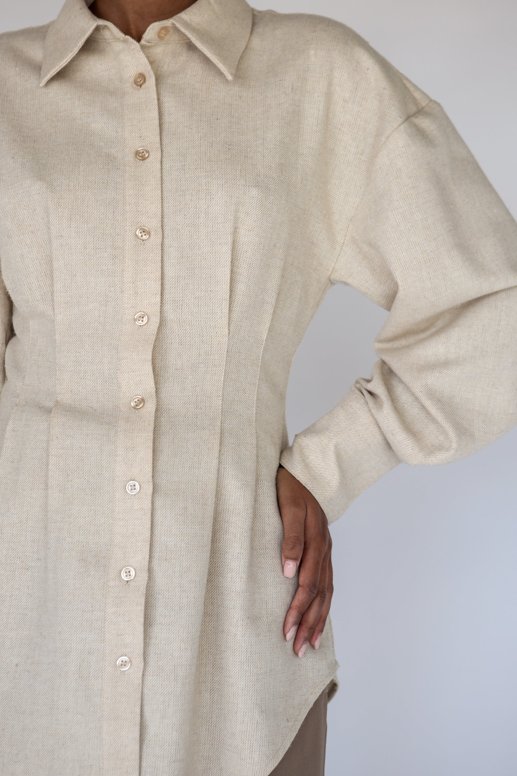 Sharon is a US10 and wears a size L in our Sculpted Button Up in Beige.