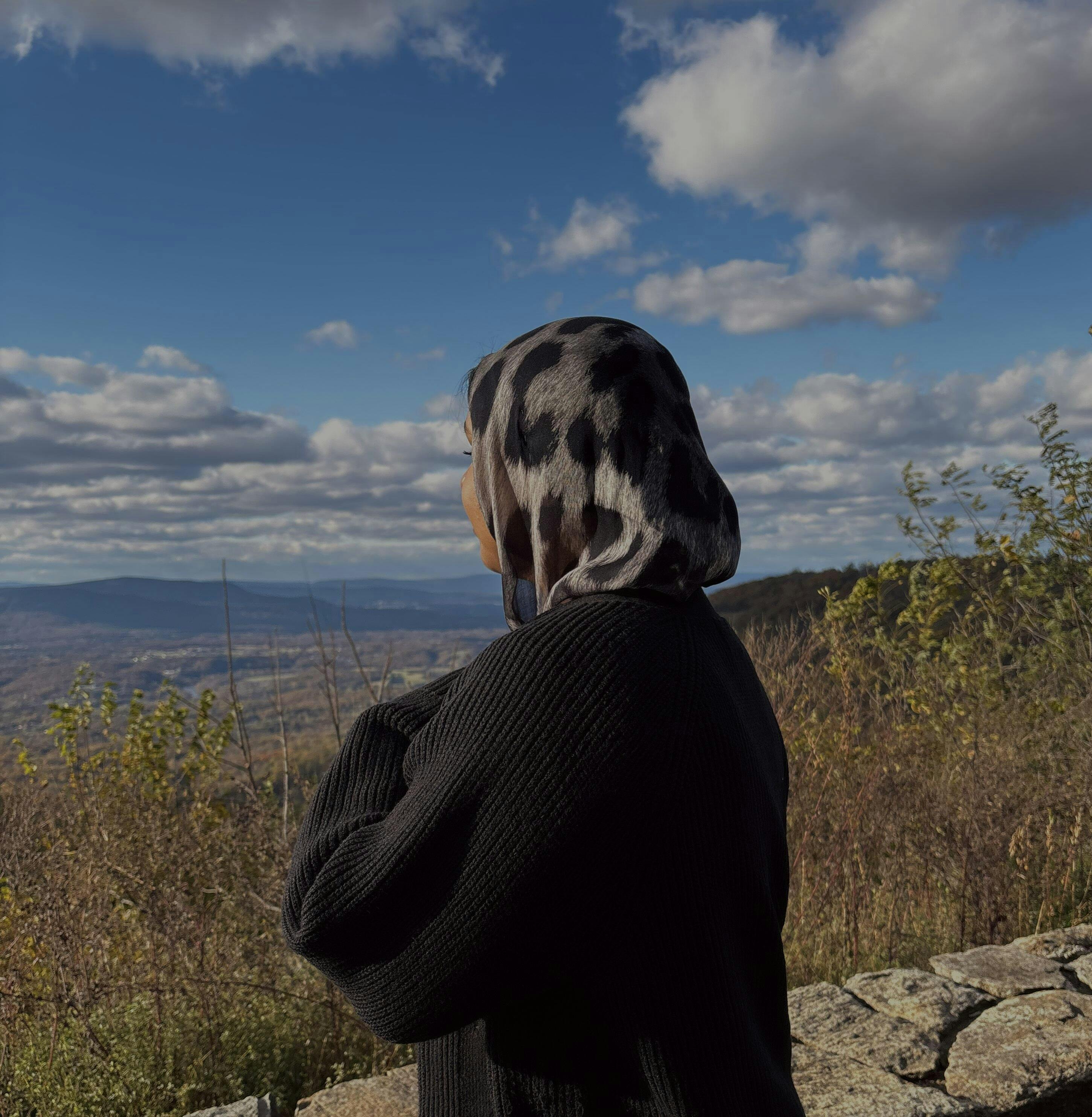 Woman wearing a black and white leopard patterned hijab against a plain background