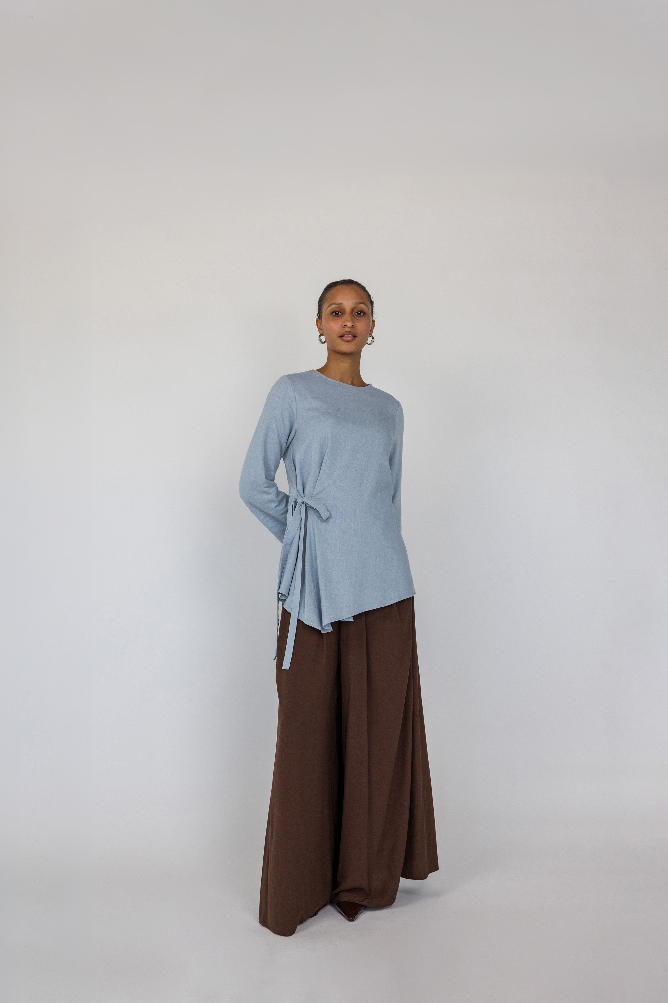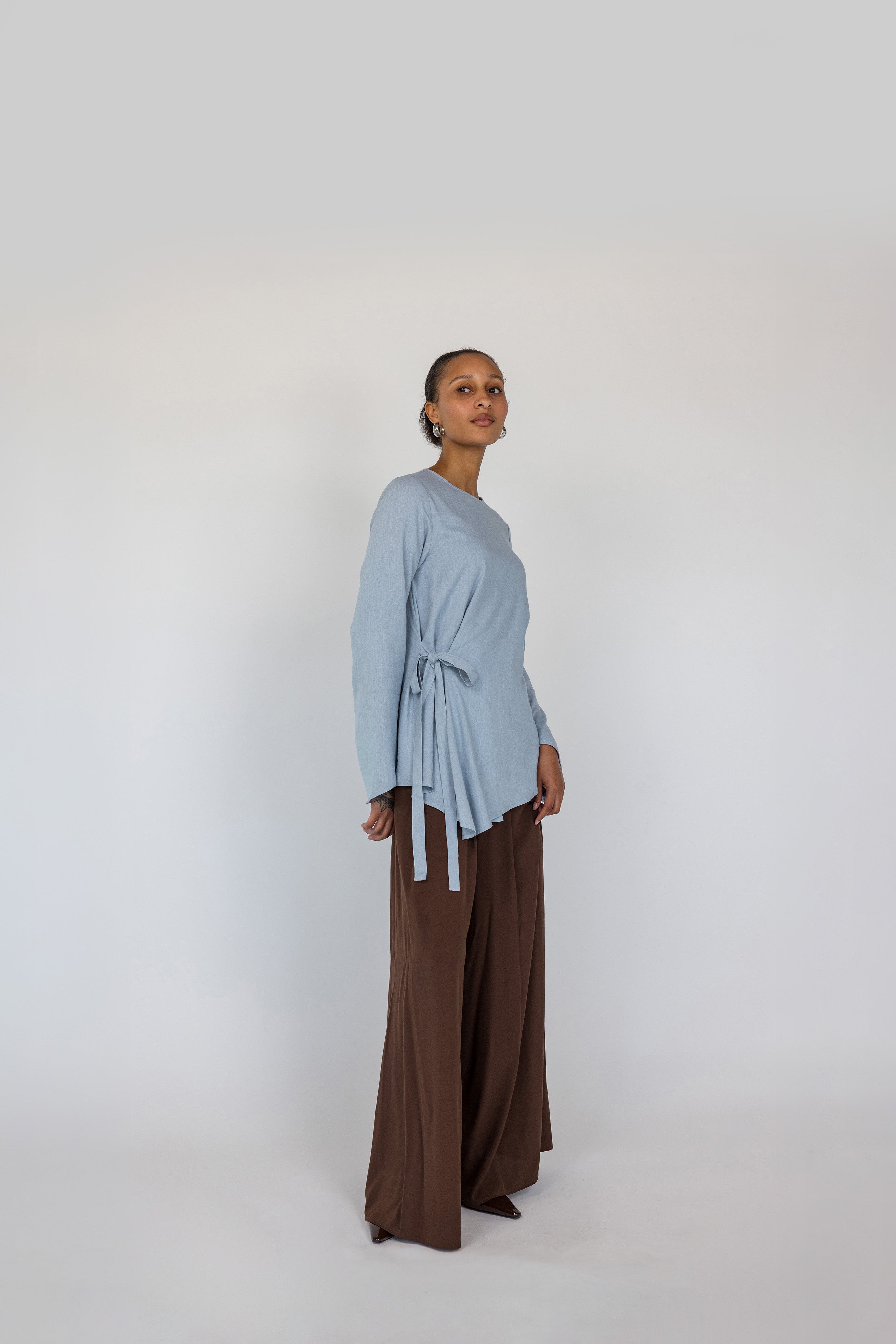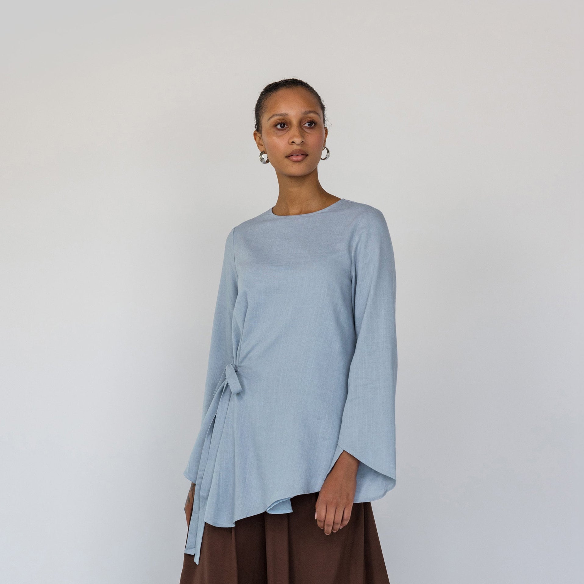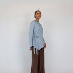 Marietou is a US size 2 and wears our Tie Front Top in Blue in a size XS.