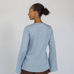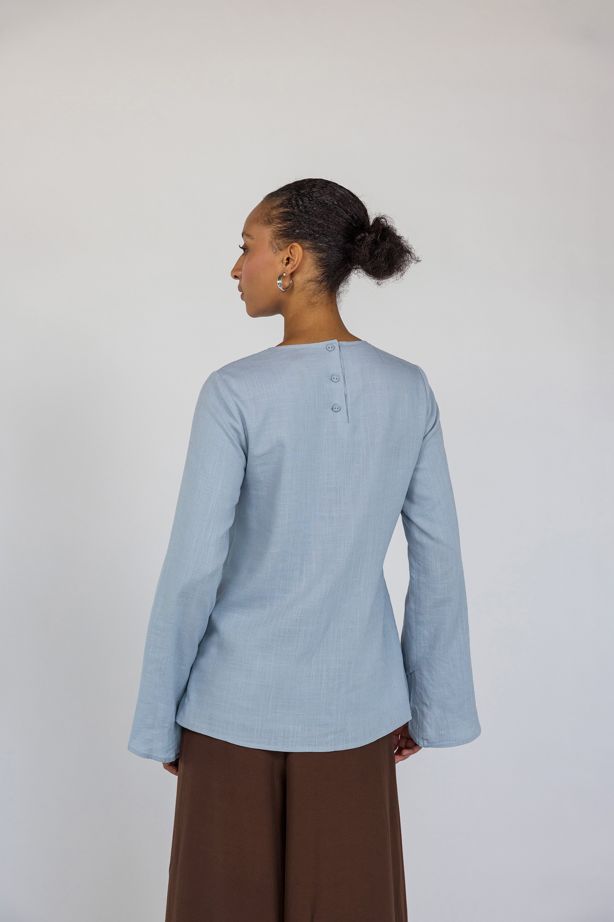 Amazing shirt that can be worn in so many ways! It is lined so not see through at all, the tie looks amazing, and the fabric feels amazing as it is made of linen. The light blue looks the same in person as it does online. Worth the price, can be worn in hot weather or even as it gets chillier with skirts or jeans.