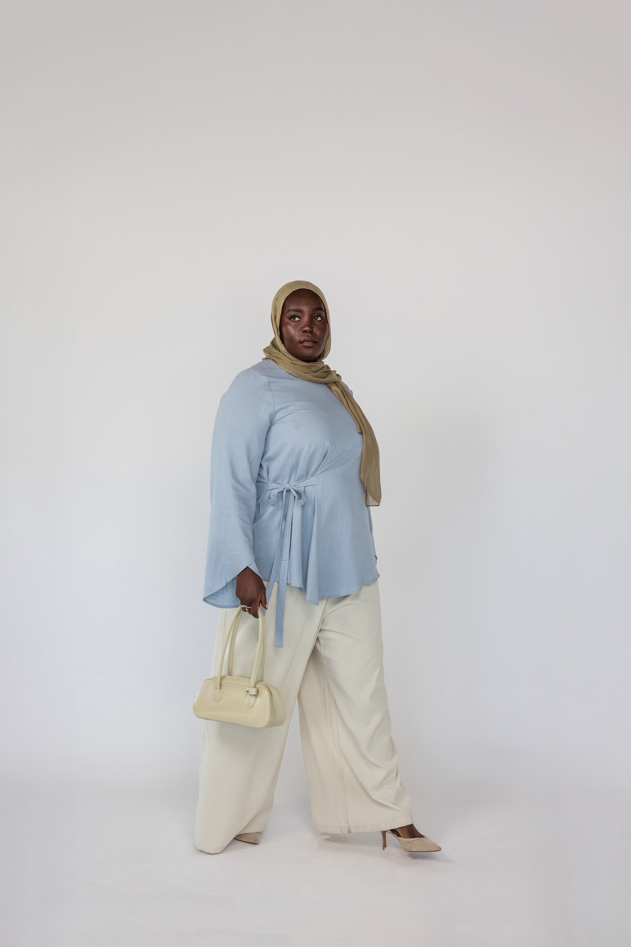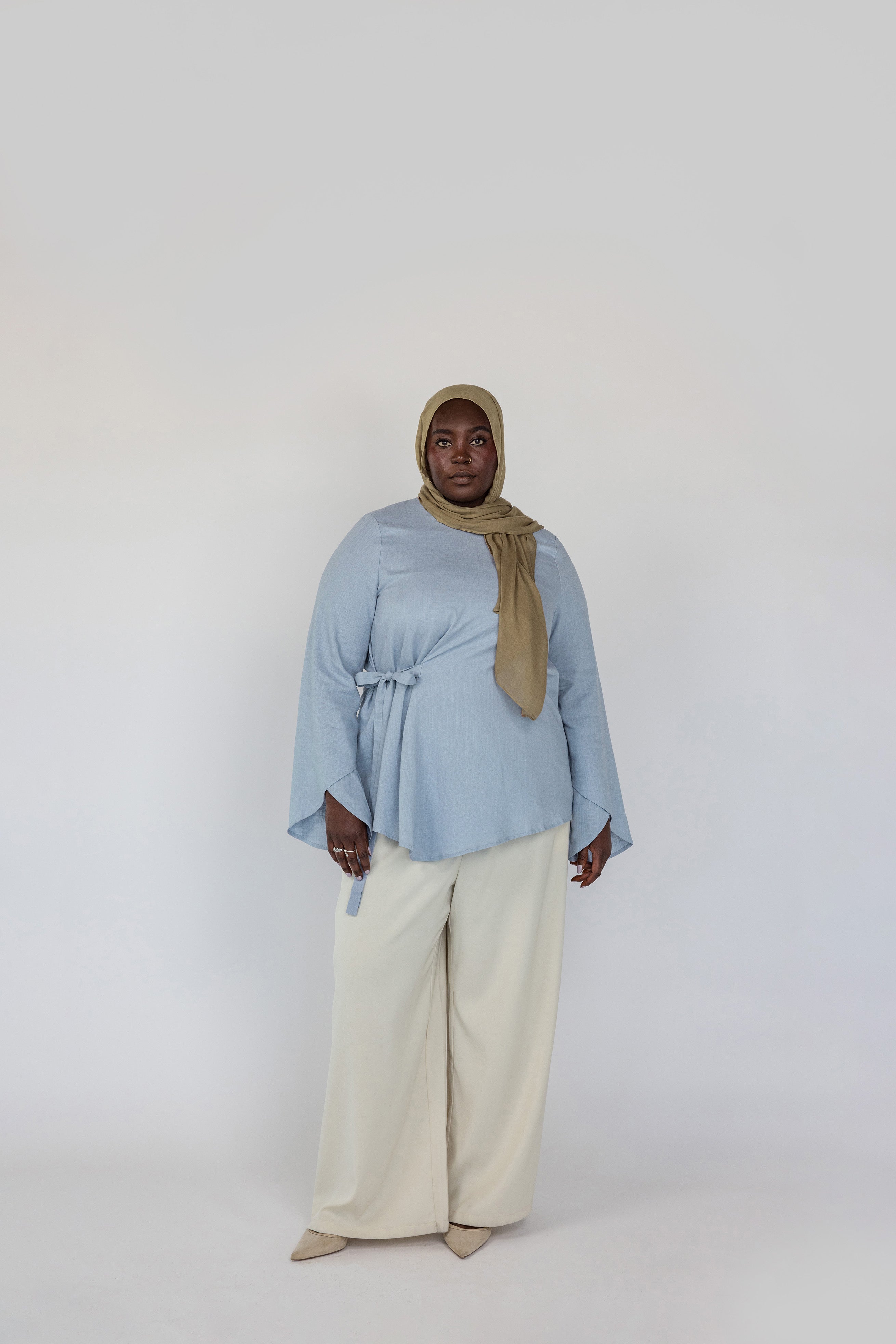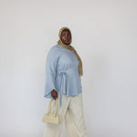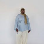 Khasnaa is a US size 16 and wears our Tie Front Top in Blue in a size 2XL.