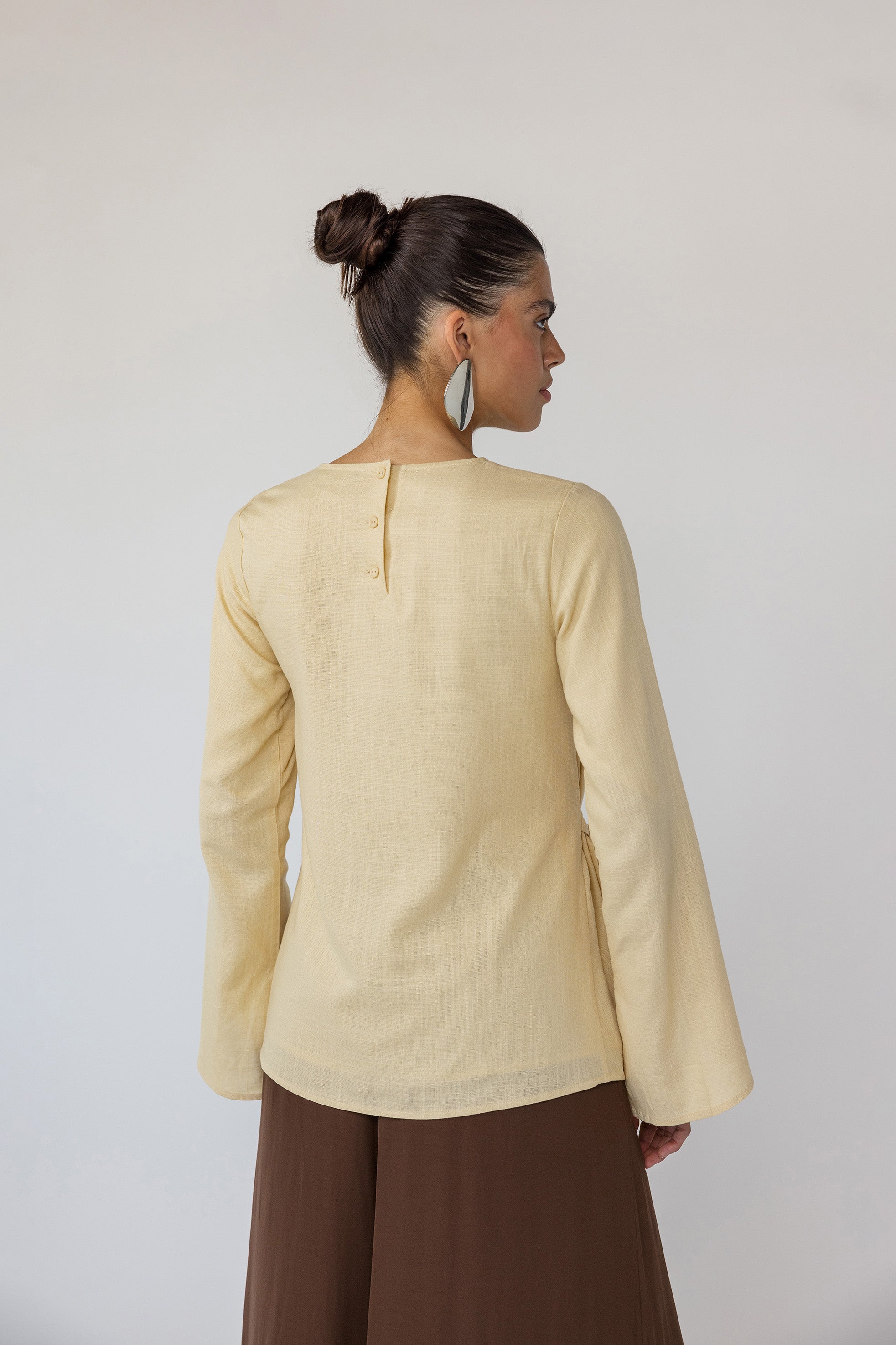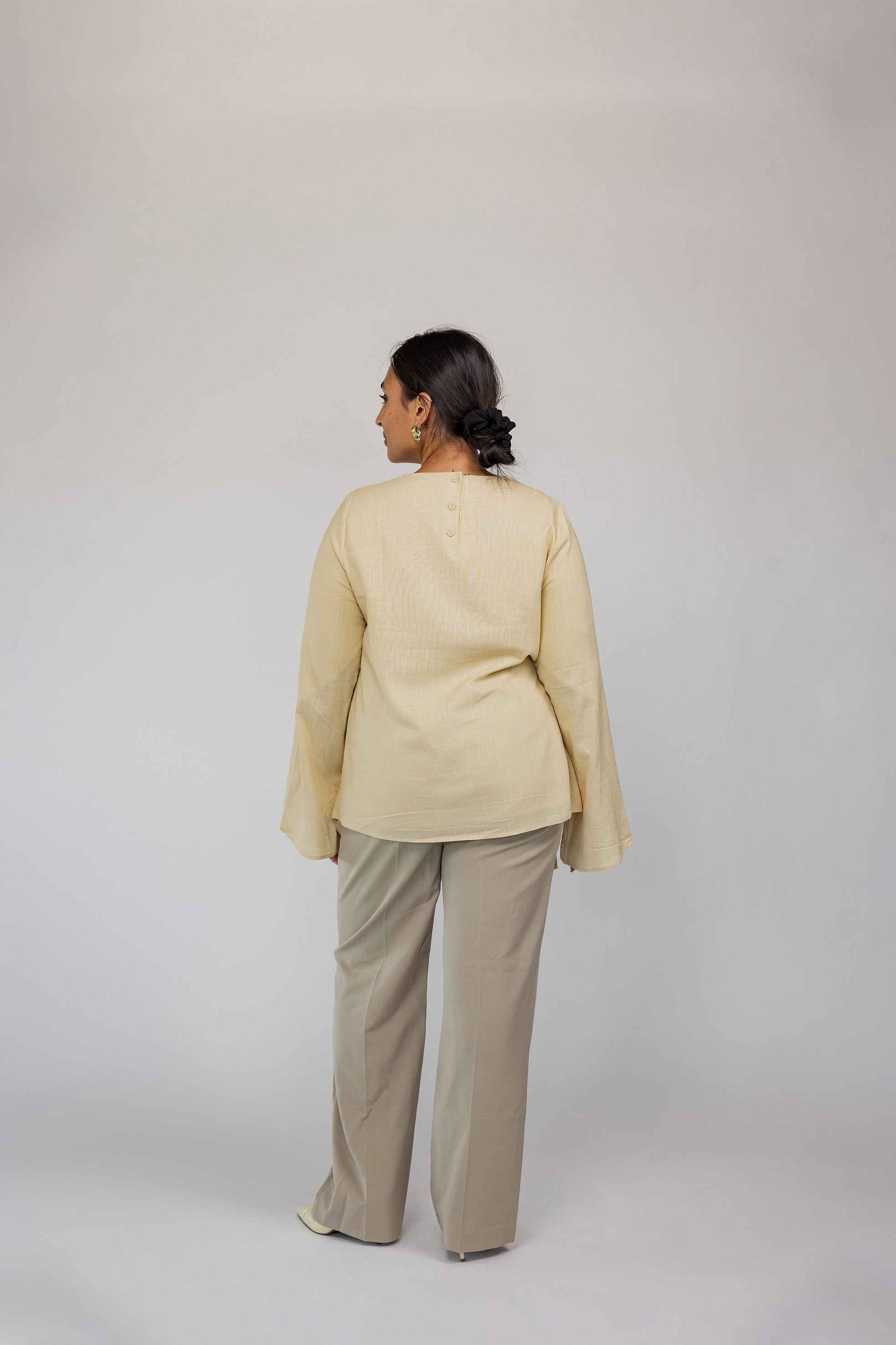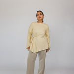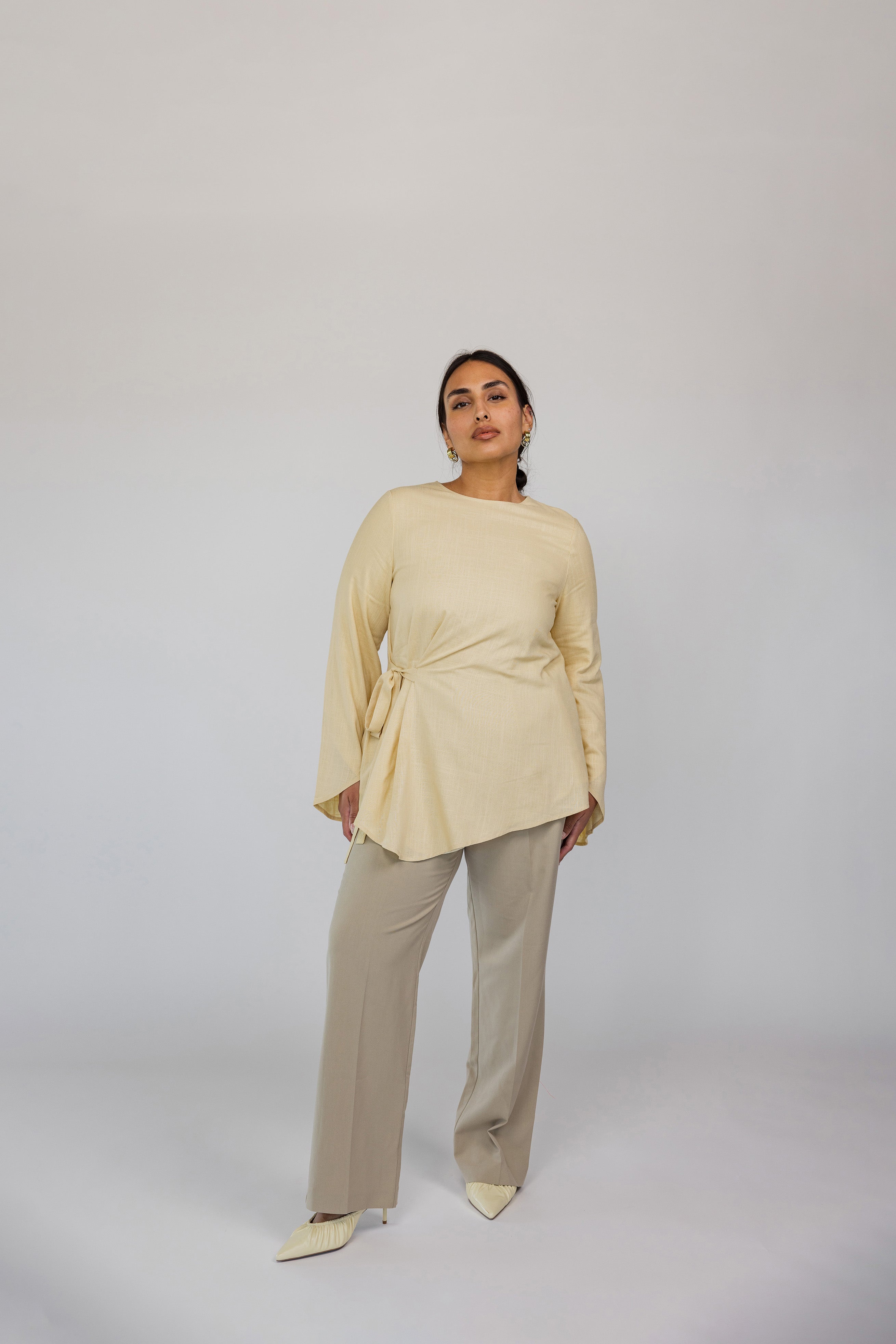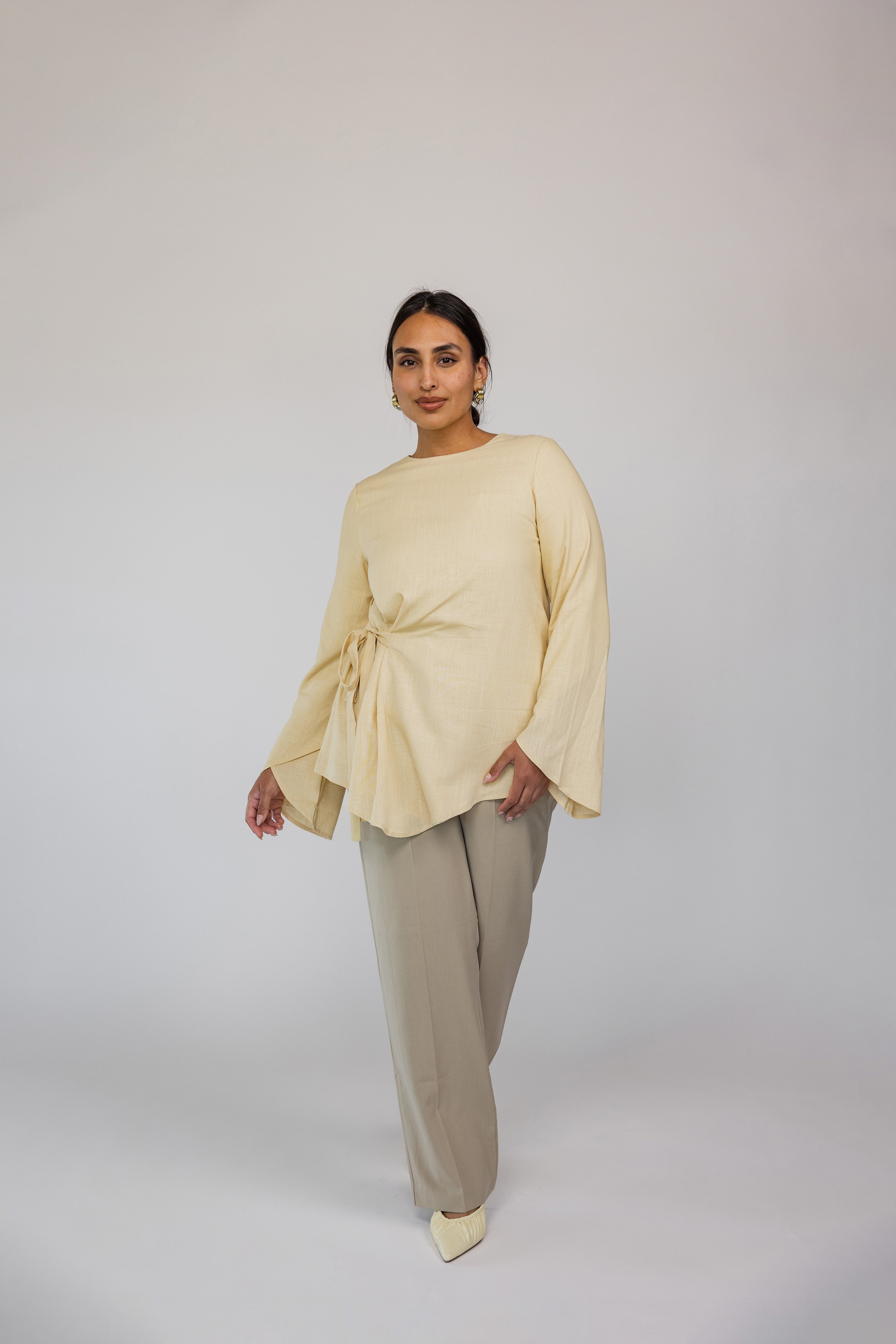 Lauren is a US 2 and wears our Tie Front Top in Butter Yellow in a size XS.