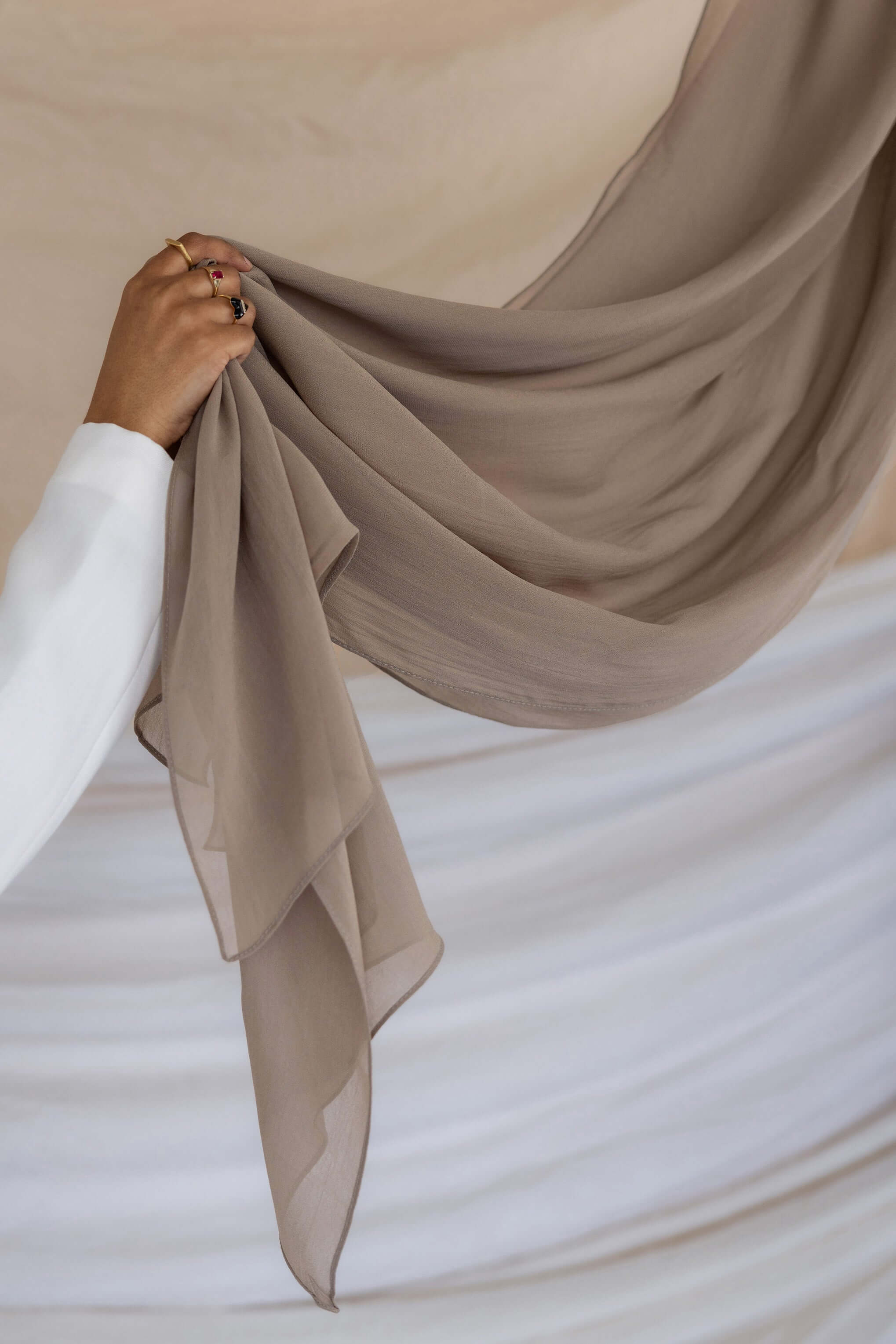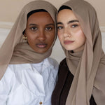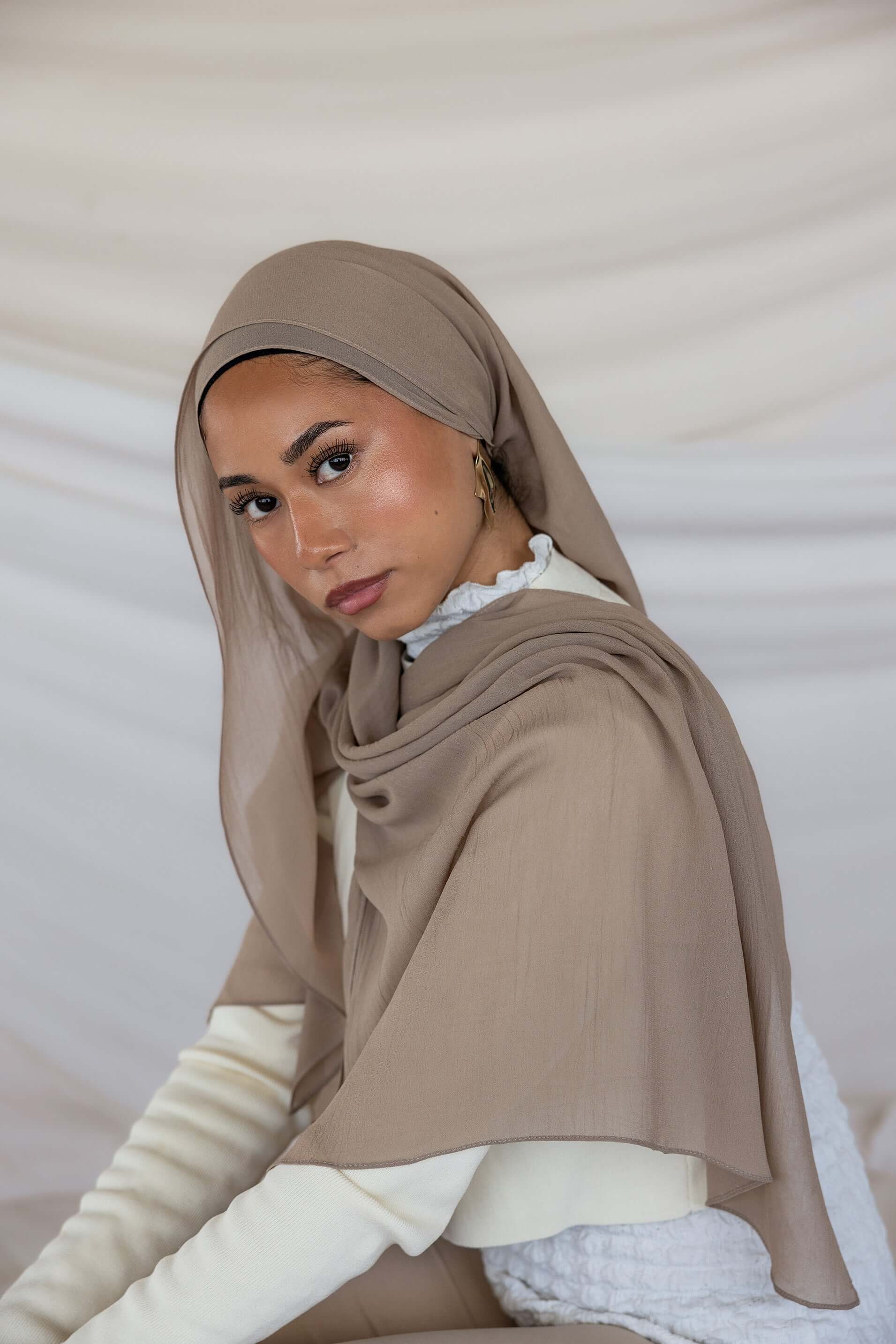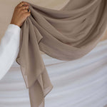 Elevate any look with this sophisticated smoky hijab. Crafted in a new Crepe Chiffon fabric that’s cool to the touch and drapes gorgeously. This complex neutral shade blends both the hues of taupe and grey to make it your next go-to scarf. Made of 100% cotton bemberg. Experience the luxury of our VELA truffle mushroom hijab, part of the Vela crepe chiffon collection. A stylish alternative to a modal hijab.