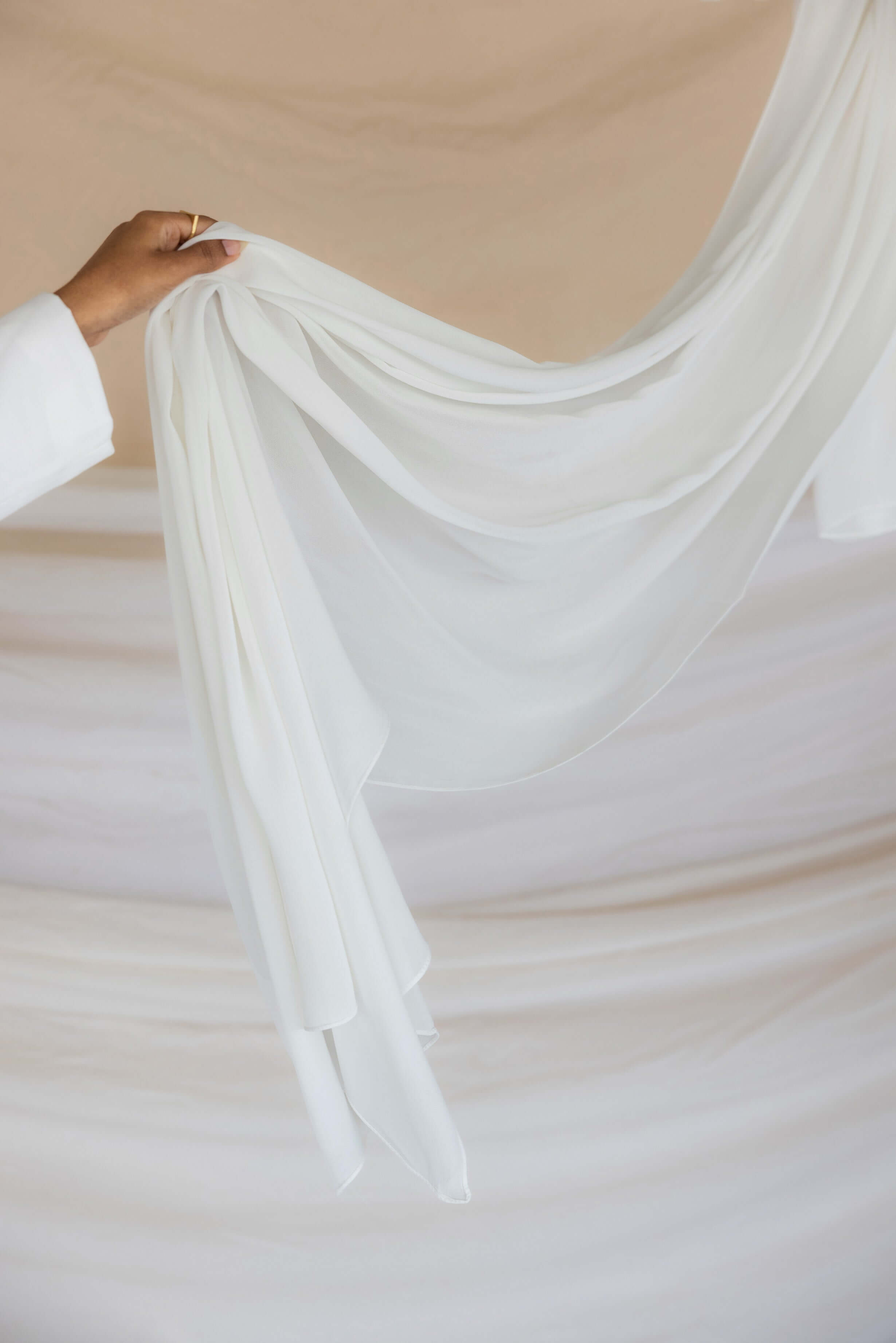 In our new feathery soft Crepe Chiffon, this dreamy white hijab is the one you’ve been waiting for. Light as a cloud and cool to the touch, no other hijab will drape like this. Made of 100% cotton bemberg. Shop our white crepe chiffon online and experience the luxury of Vela crepe chiffon. Perfect for those seeking the finest crepe chiffon fabric.